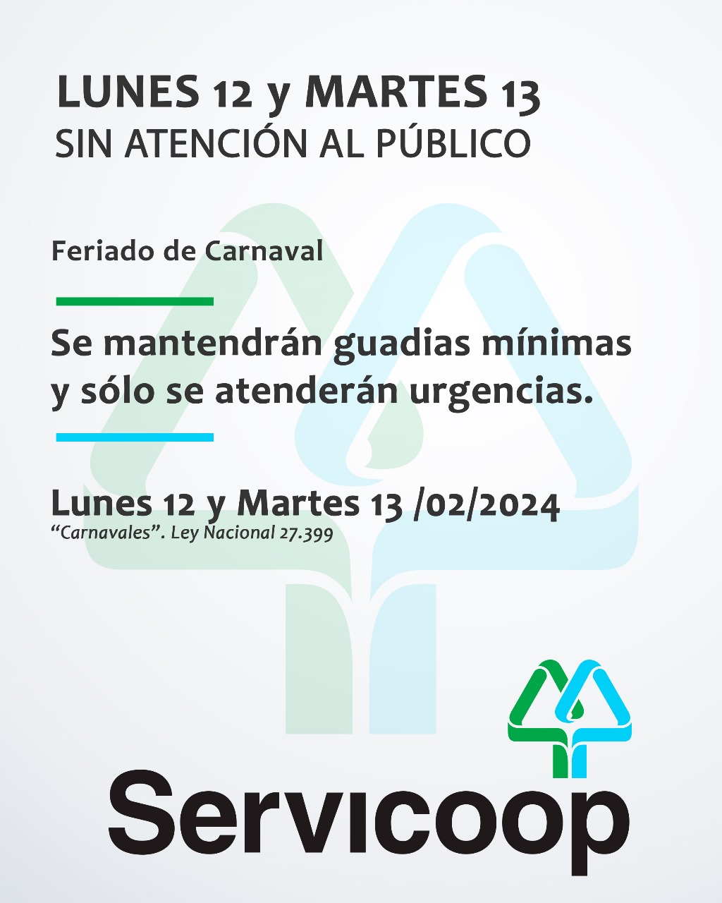 El lunes 12 y martes 13, nuestras oficinas permanecerán cerradas, debido al feriado que celebra el “Carnaval” (Ley 27.339). Se mantendrán en operaciones las guardias técnicas mínimas y sólo se atenderán urgencias.
