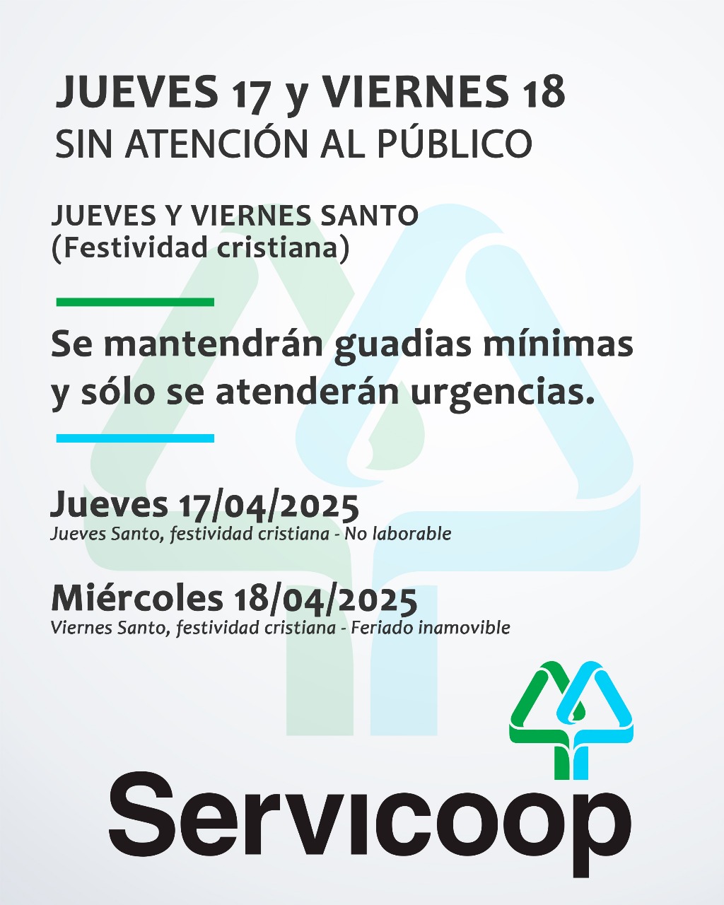 Informamos a todos los usuarios y a la comunidad en general, que el día de mañana jueves 17 y el viernes 18 de abril , no habrá atención al público debido a los feriados por Semana Santa (Festividad Cristiana) instaurados por la Ley Nacional 27.339. Se mantendrán guardias mínimas y sólo se atenderán urgencias.