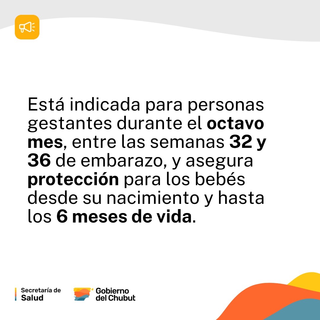 La vacuna está indicada a todas las personas gestantes durante el octavo mes de embarazo (entre las semanas 32 y 36). De esta manera, los bebés quedan protegidos desde el nacimiento y hasta los 6 meses de vida.