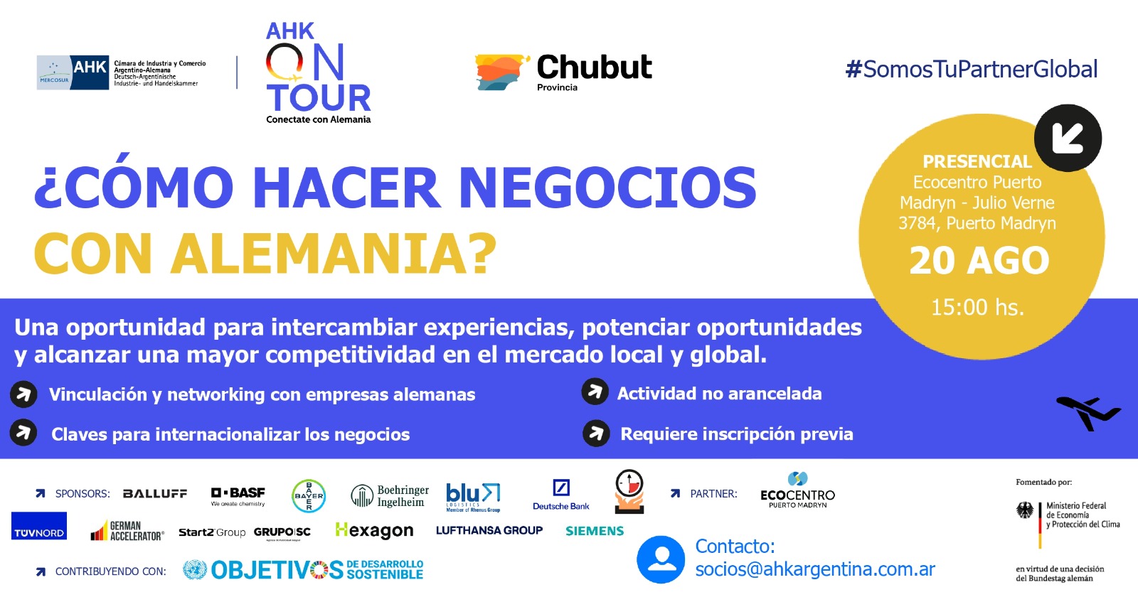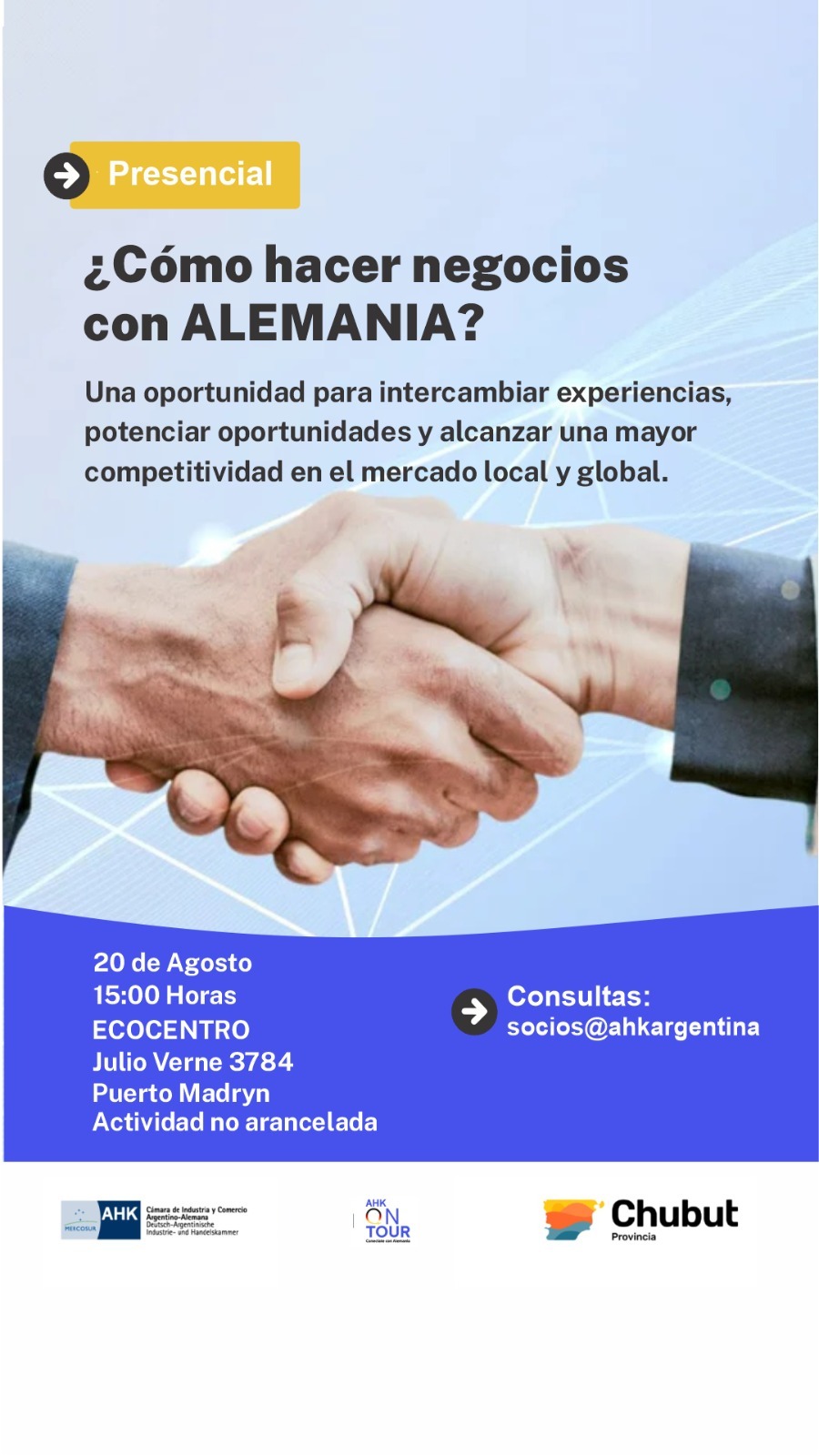 En ese marco, desde el Estado Provincial se invita a participar de la AHK Argentina (Cámara de Industria y Comercio Argentino Alemana) que visitará Chubut con una delegación de empresas socias bajo el lema, «Cómo Hacer Negocios con Alemania».