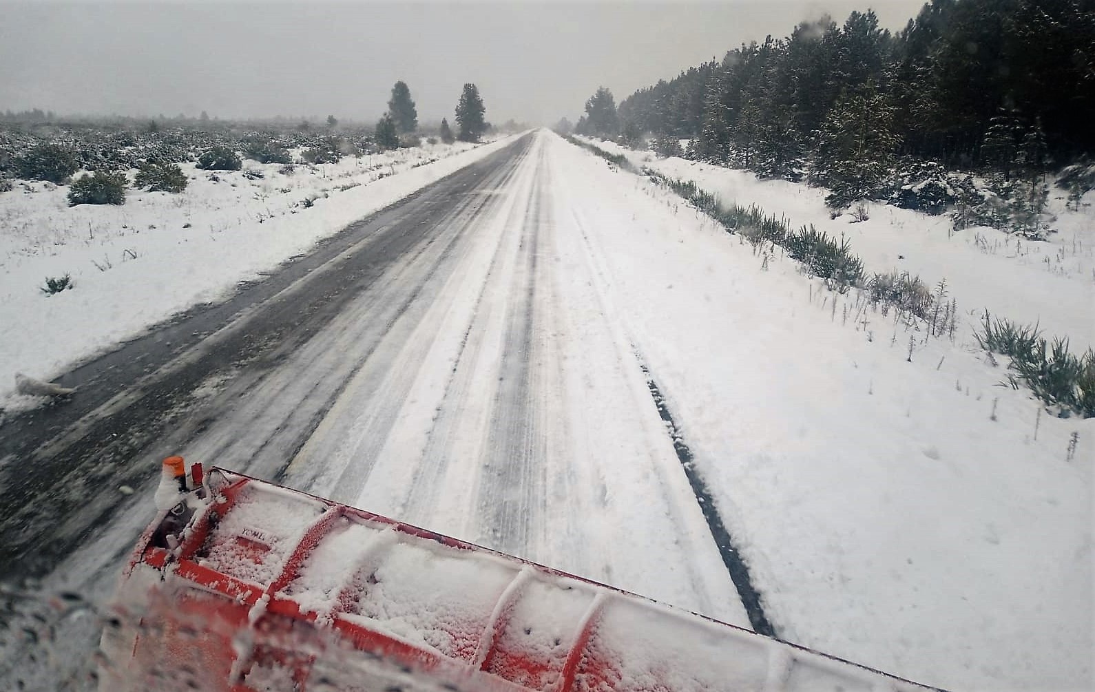 Así está ahora la Ruta N40 entre Leleque y Epuyén. Camión barrenieve de Vialidad Nacional despejando la calzada y distribuyendo sal. La transitabilidad se mantiene habilitada con extrema precaución, ya que presenta sectores con escarcha, nieve y está resbaladiza. Banquinas con nieve. Nevando en sectores.