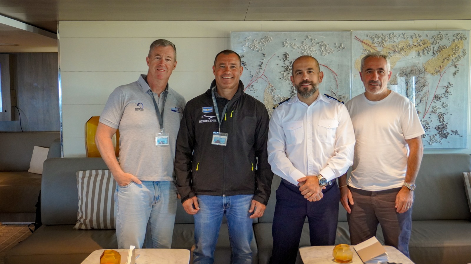 Durante la escala, el titular de la Administración Portuaria de Puerto Madryn (APPM), Joaquín Aristarain, junto al director operativo, Martín Liendo, y el asesor ad honorem de la Provincia del Chubut para cruceros antárticos, Germán Manterola, fueron recibidos a bordo por el capitán de la embarcación, Daher Charbel.