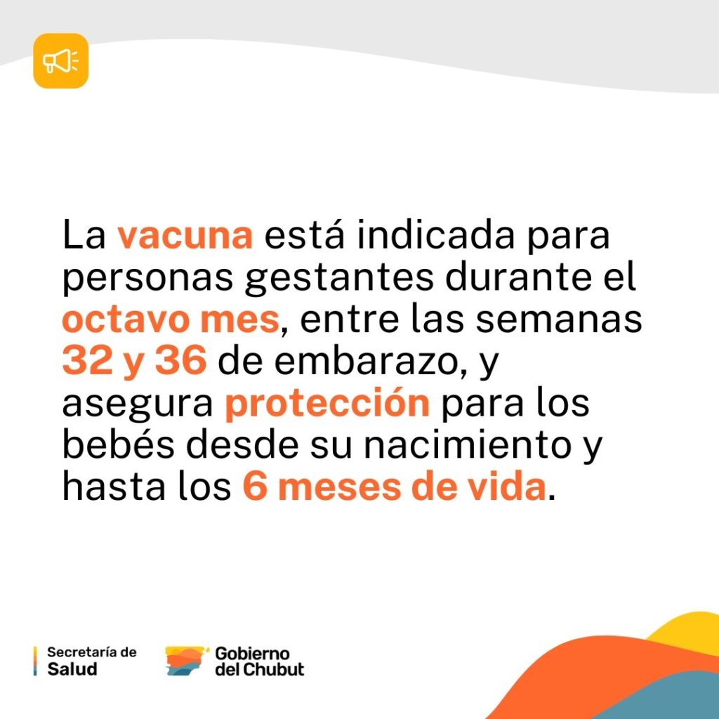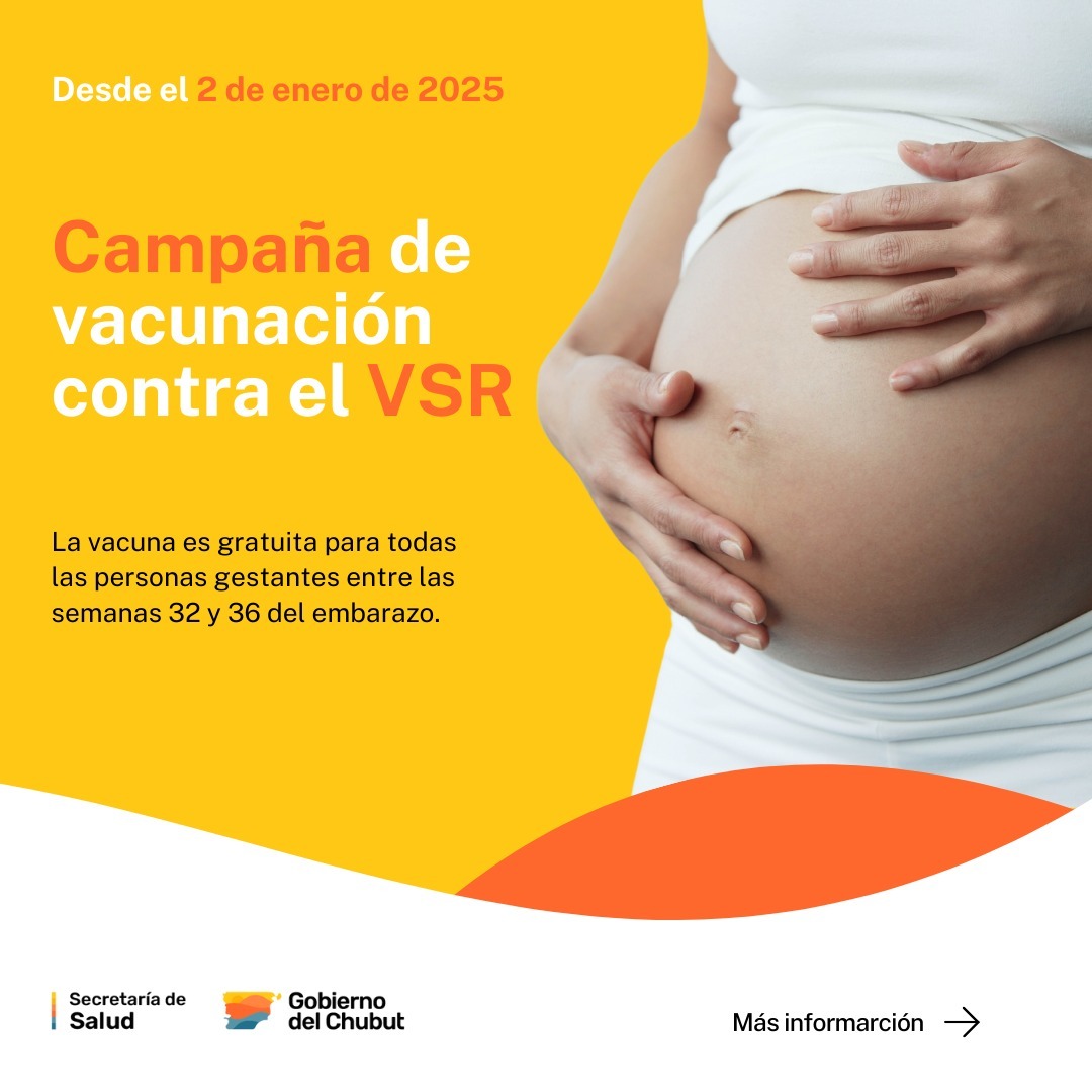 El Gobierno del Chubut, a través de la Secretaría de Salud, realizará a partir del próximo jueves 2 de enero una nueva Campaña de Vacunación contra el Virus Sincicial Respiratorio (VSR), que está dirigida a las personas gestantes que se encuentran entre las semanas 32 y 36 de gestación, es decir, en el octavo mes de embarazo.