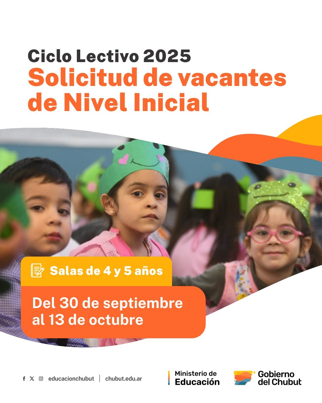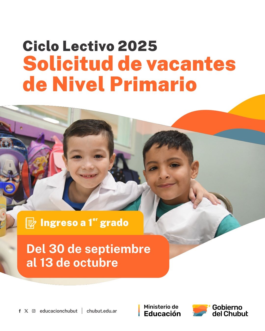 El Gobierno del Chubut, que conduce Ignacio «Nacho» Torres informa, a través del Ministerio de Educación del Chubut, que desde el próximo lunes 30 de septiembre al 20 de octubre estará abierta la solicitud de vacantes para ingresantes del Ciclo Lectivo 2025. Este proceso se realizará de manera online a través de los formularios disponibles en la página oficial del Ministerio de Educación del Chubut: www.chubut.edu.ar