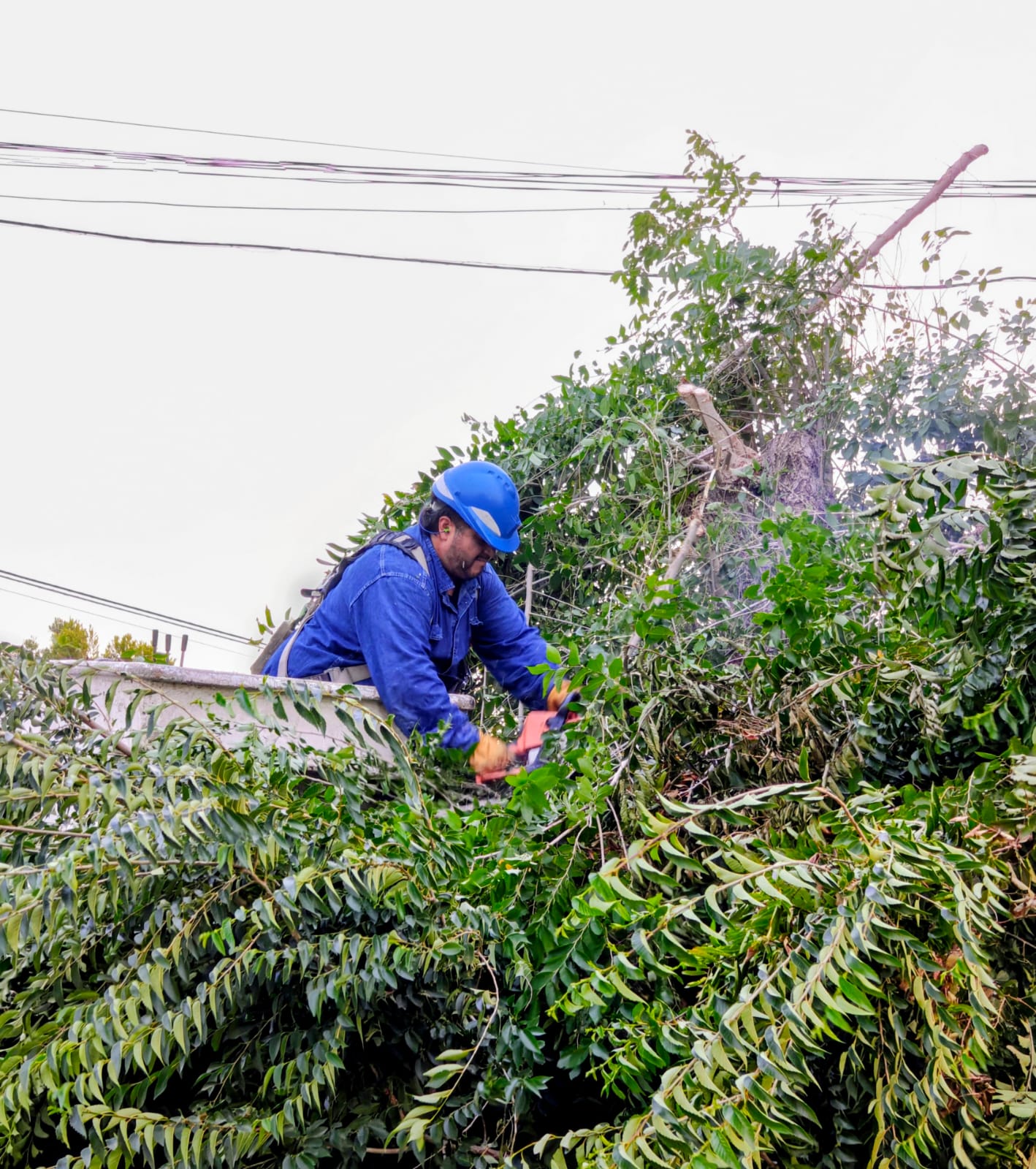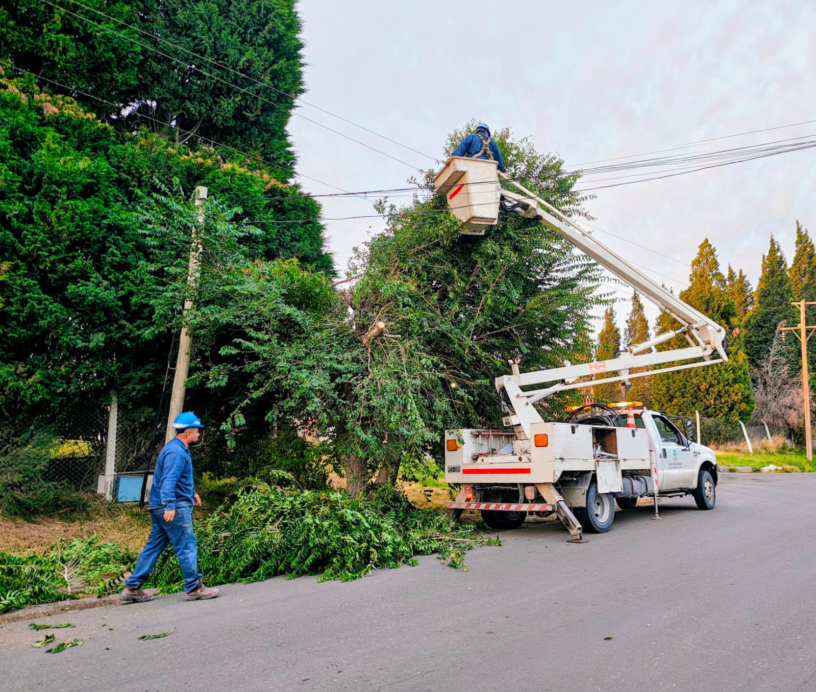 La vegetación existente es responsabilidad de los frentistas. Son ellos lo que deben arbitrar los medios para que las ramas no alcancen el espacio de seguridad de las redes de energía. La Cooperativa interviene cuando la vegetación ya invadió el espacio y pone en riesgo la prestación del servicio. Durante los temporales de viento más de 80% de los reclamos de los usuarios por fallas o falta de suministro obedece a esta circunstancia. En esta oportunidad el equipo de redes realizó tareas de despeje aéreo sobre distintas arterias del parque industrial pesquero de la ciudad.