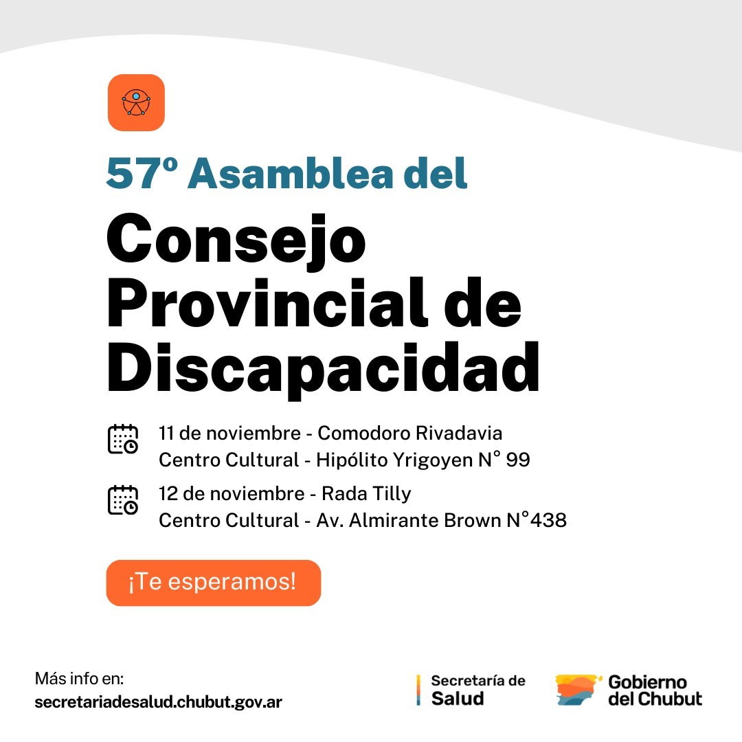 Con el objetivo de fortalecer el trabajo coordinado orientado a la inclusión y accesibilidad de las personas con discapacidad, y en el marco de las políticas fijadas en la materia por la gestión del gobernador Ignacio «Nacho» Torres; el Gobierno del Chubut, a través de la Secretaría de Salud, realizará la próxima semana la “57° Asamblea del Consejo Provincial de Discapacidad” (COPRODIS).