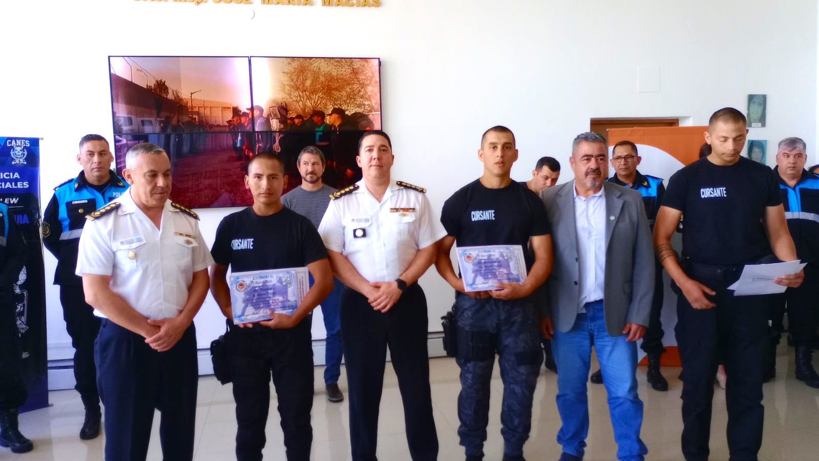 Dentro del plan de capacitación policial permanente que lleva adelante el Gobierno del Chubut para mejorar el profesionalismo de su personal, el Ministerio de Seguridad y Justicia entregó certificados a los efectivos de la sección Canes de Trelew que cumplieron con la formación enmarcada en el «IV Curso Básico Mixto Guía de Canes de Seguridad».