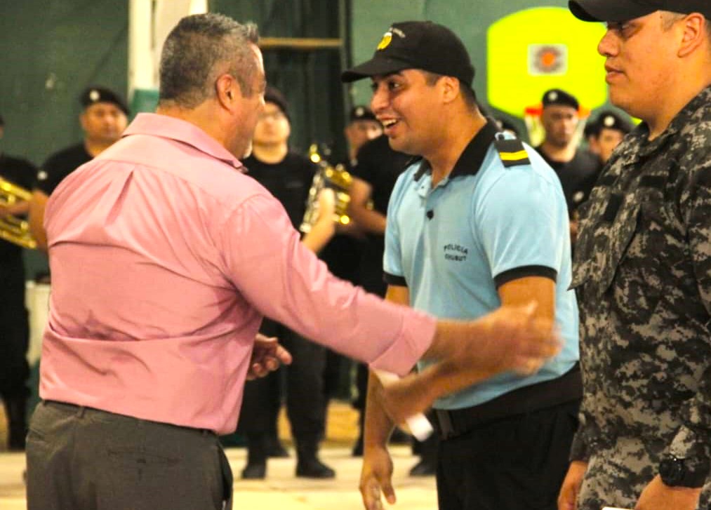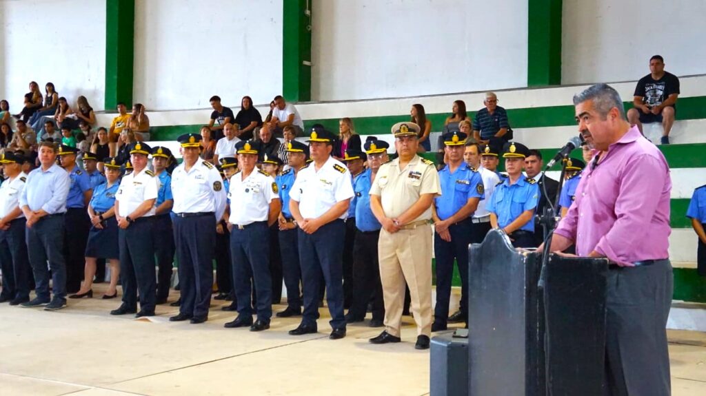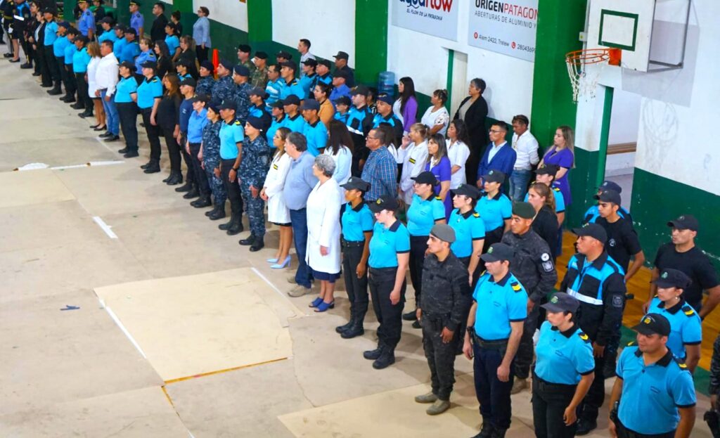 El acto se desarrolló en el gimnasio del Club Germinal y fue encabezado por el ministro de Seguridad y Justicia, Héctor Iturrioz; y el jefe y subjefe de la Policía del Chubut, Andrés García y Mauricio Zabala, respectivamente.