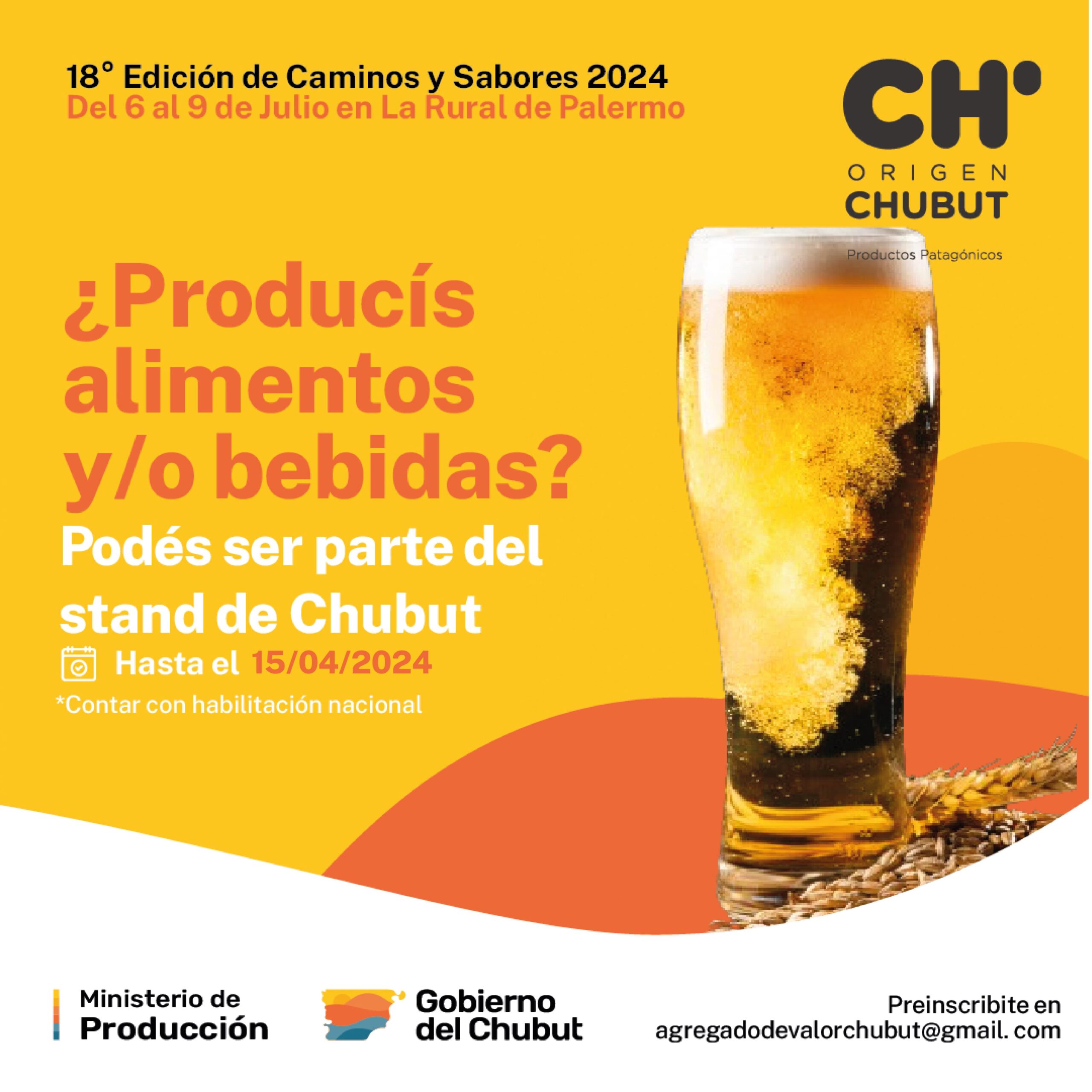 El Gobierno del Chubut, a través del Ministerio de Producción, convoca a productores de alimentos y/o bebidas de la provincia a participar de la 18° edición de la Feria Caminos y Sabores que este año tendrá lugar del 6 al 9 de julio en La Rural de Palermo, en la ciudad de Buenos Aires.