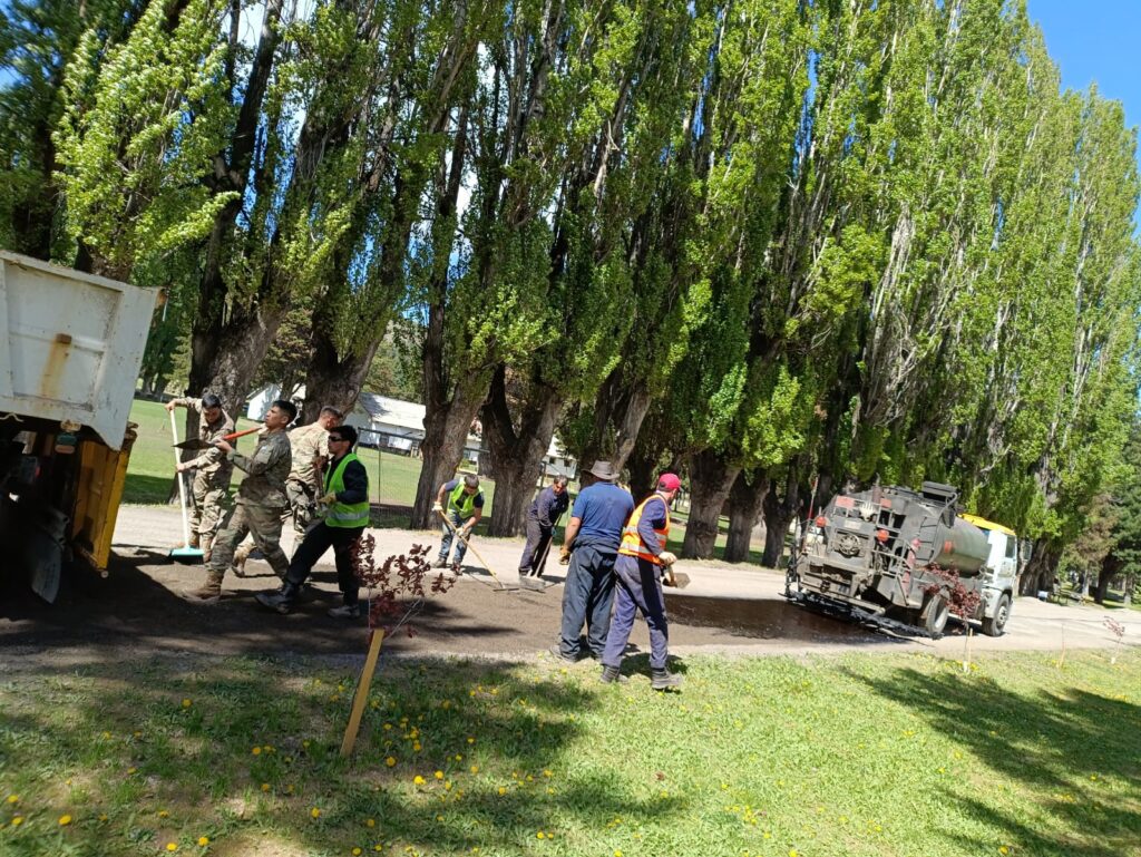 Por otra parte, desde la Administración Provincial de Vialidad se colaboró con el Ejército Argentino en las instalaciones ubicadas en la ciudad de Esquel, donde se realizó un bacheo de calles internas que se completó, luego, con una imprimación de riego asfáltico.