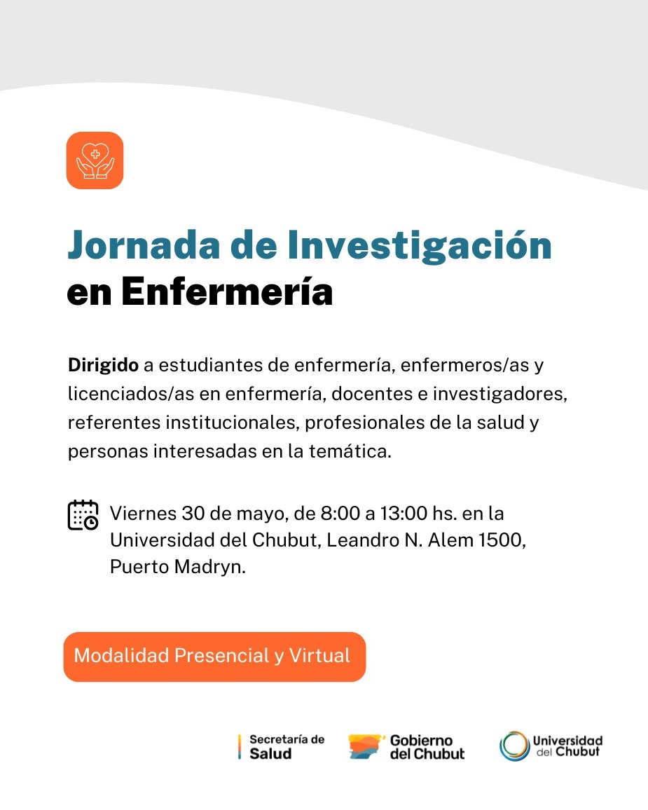 En el marco de las acciones que se promueven con el propósito de jerarquizar el recurso humano sanitario, el Gobierno del Chubut, a través de la Secretaría de Salud, desarrollará en Puerto Madryn el viernes 30 de mayo, de 8 a 13 horas, una Jornada de Investigación en Enfermería.