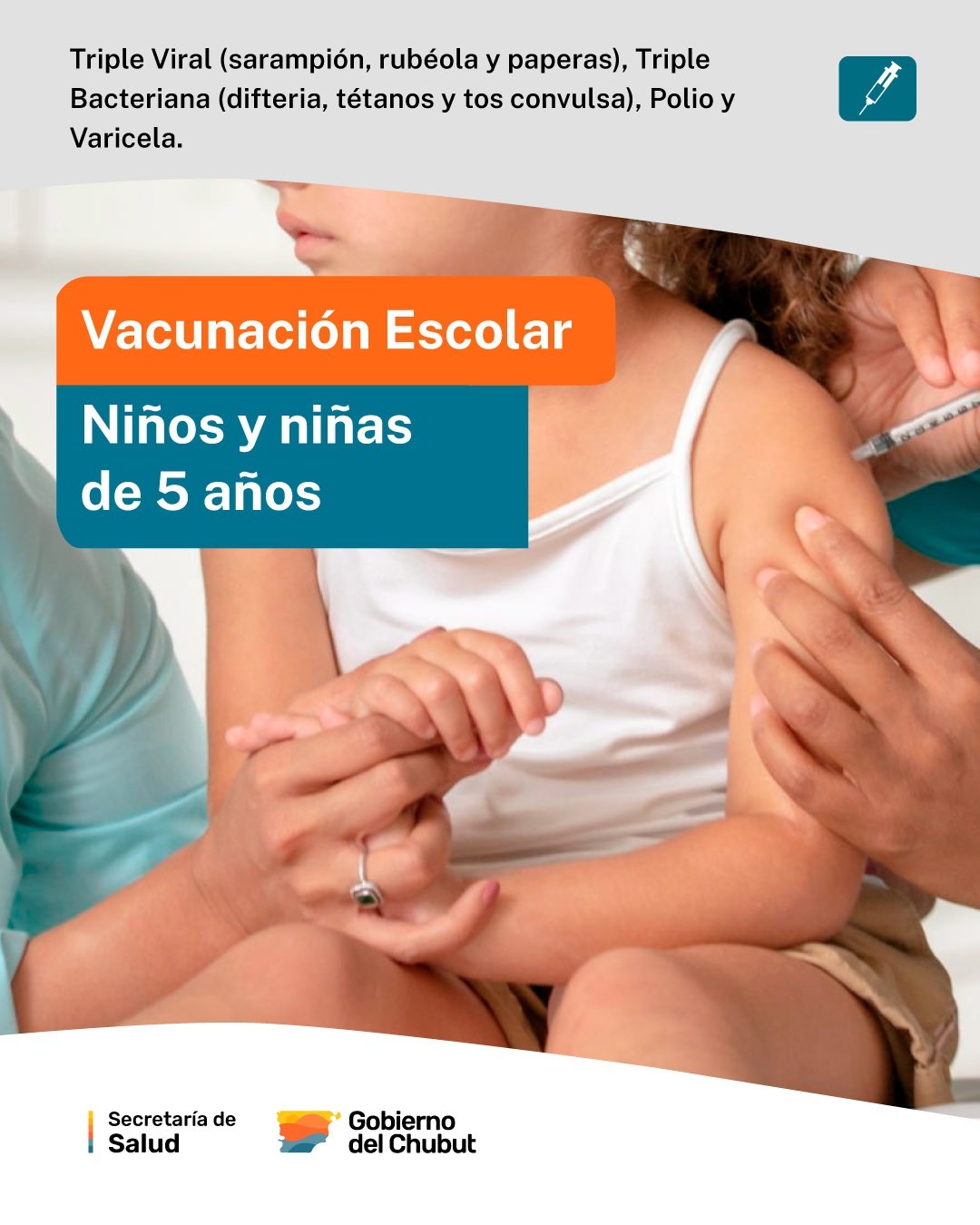 Por otro lado, desde la Secretaría de Salud del Chubut se recordó que las vacunas que deben recibir las niñas y los niños de 5 años son las siguientes: la vacuna Triple Viral, que previene el sarampión, la rubéola y las paperas; la vacuna Triple Bacteriana Celular, que previene la difteria, el tétanos y la tos convulsa; el refuerzo de la vacuna Salk, que previene la poliomielitis; y la segunda dosis de la vacuna contra la varicela.