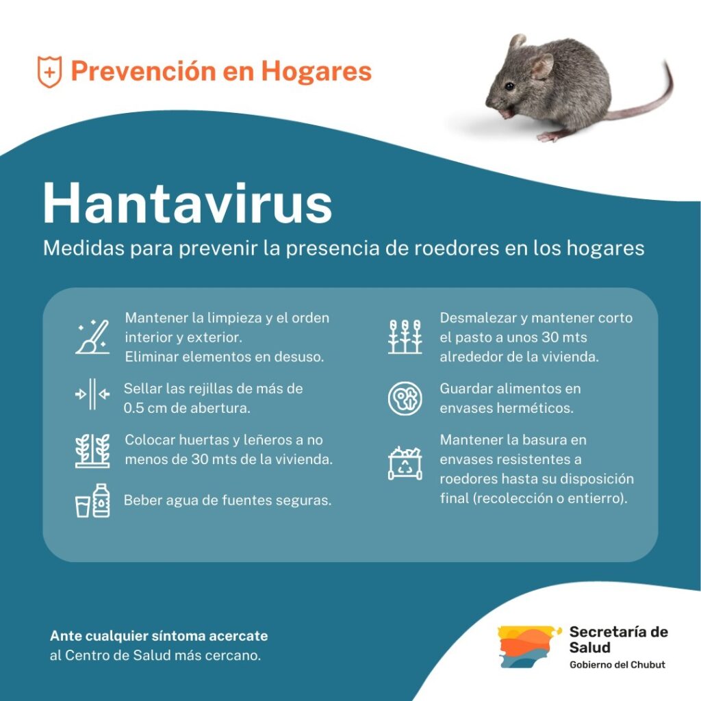 Además, como medidas de prevención del hantavirus desde la cartera sanitaria provincial se recomienda mantener protegidas las fuentes de abastecimiento de agua; eliminar malezas del patio, sellando previamente posibles accesos a la vivienda; tapar los agujeros de la casa con materiales resistentes; proteger los alimentos manteniéndolos en envases herméticos y depositar la basura en recipientes con tapa.