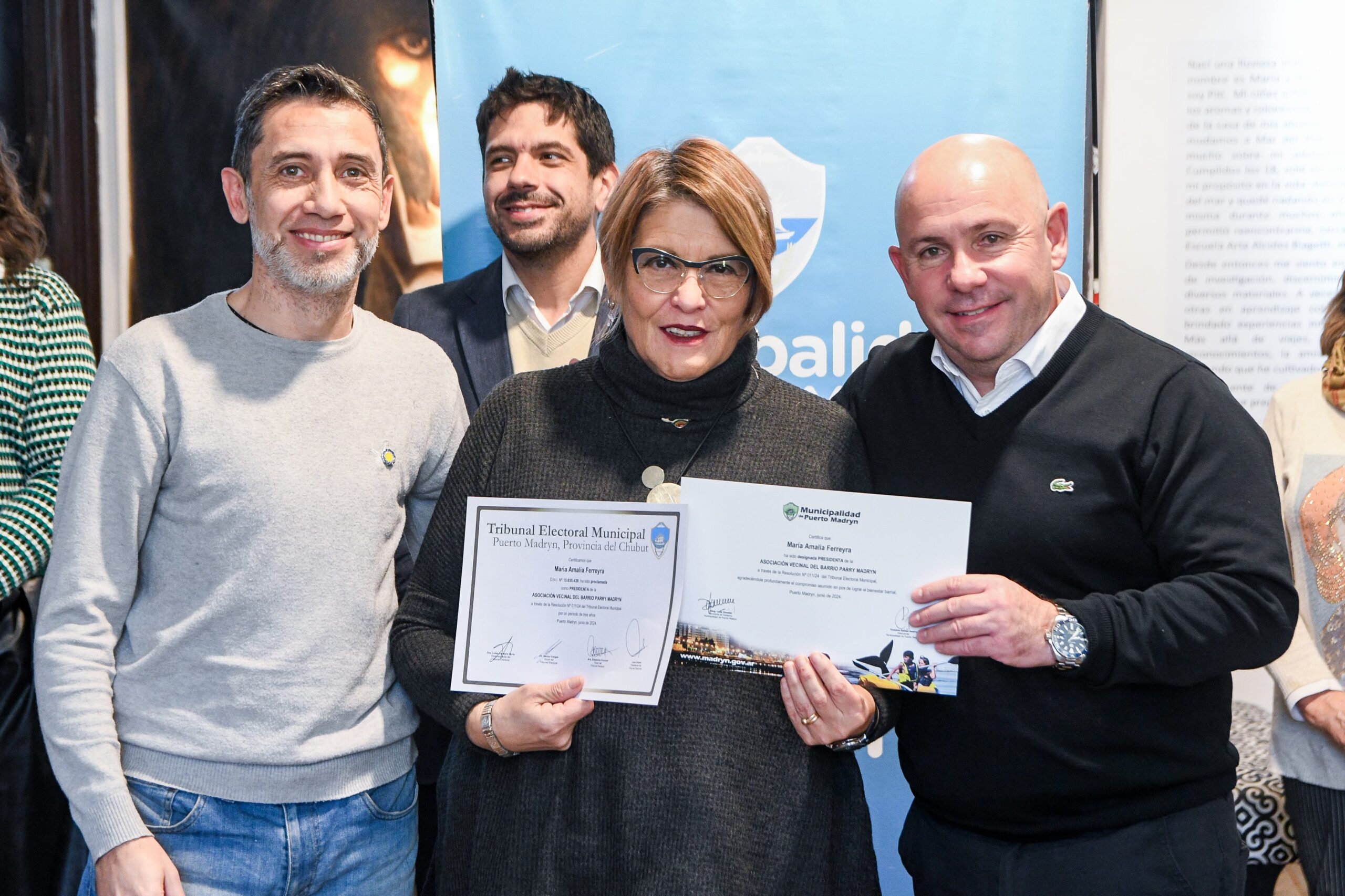 En la entrega de certificados, además de Sastre y las autoridades del Tribunal Electoral de Puerto Madryn, también estuvieron presentes el viceintendente Martín Ebene; la secretaria de Gobierno, Leila Zanette; el subsecretario de Gobierno, Enzo Terrera, y el titular de la Oficina Municipal de Asociaciones Vecinales, Daniel Martínez.