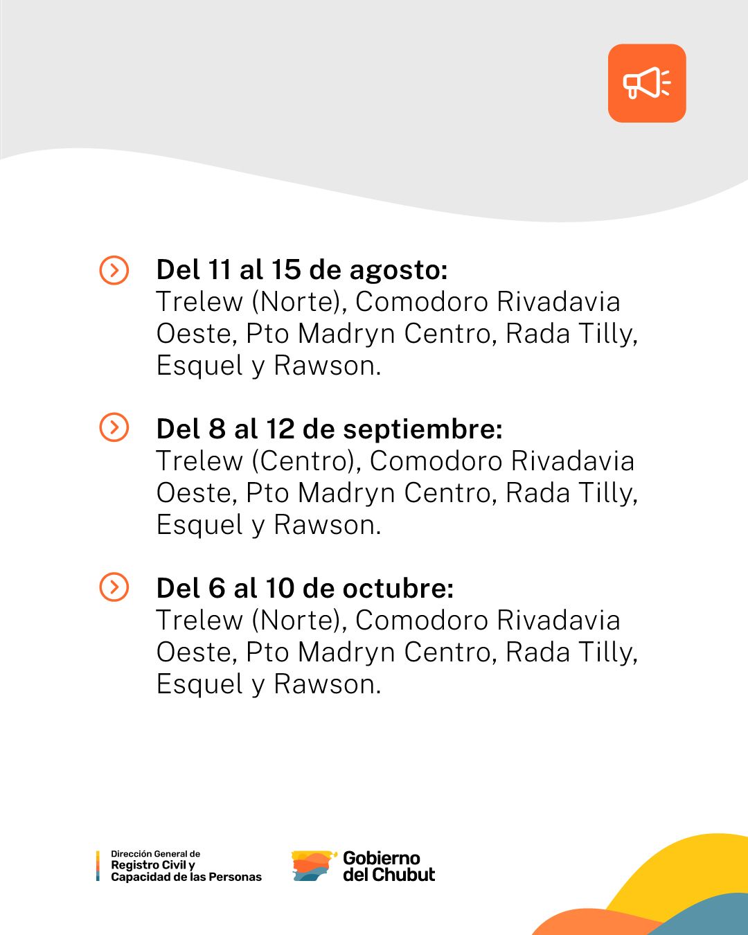 El Gobierno del Chubut, a través del Ministerio de Gobierno y la Dirección General del Registro Civil y Capacidad de las Personas, informa que durante los meses de agosto, septiembre y octubre se llevarán adelante jornadas especiales de atención extendida en delegaciones de seis ciudades de la provincia, con el objetivo de mejorar la calidad del servicio y facilitar el acceso a los trámites vinculados a la identidad.