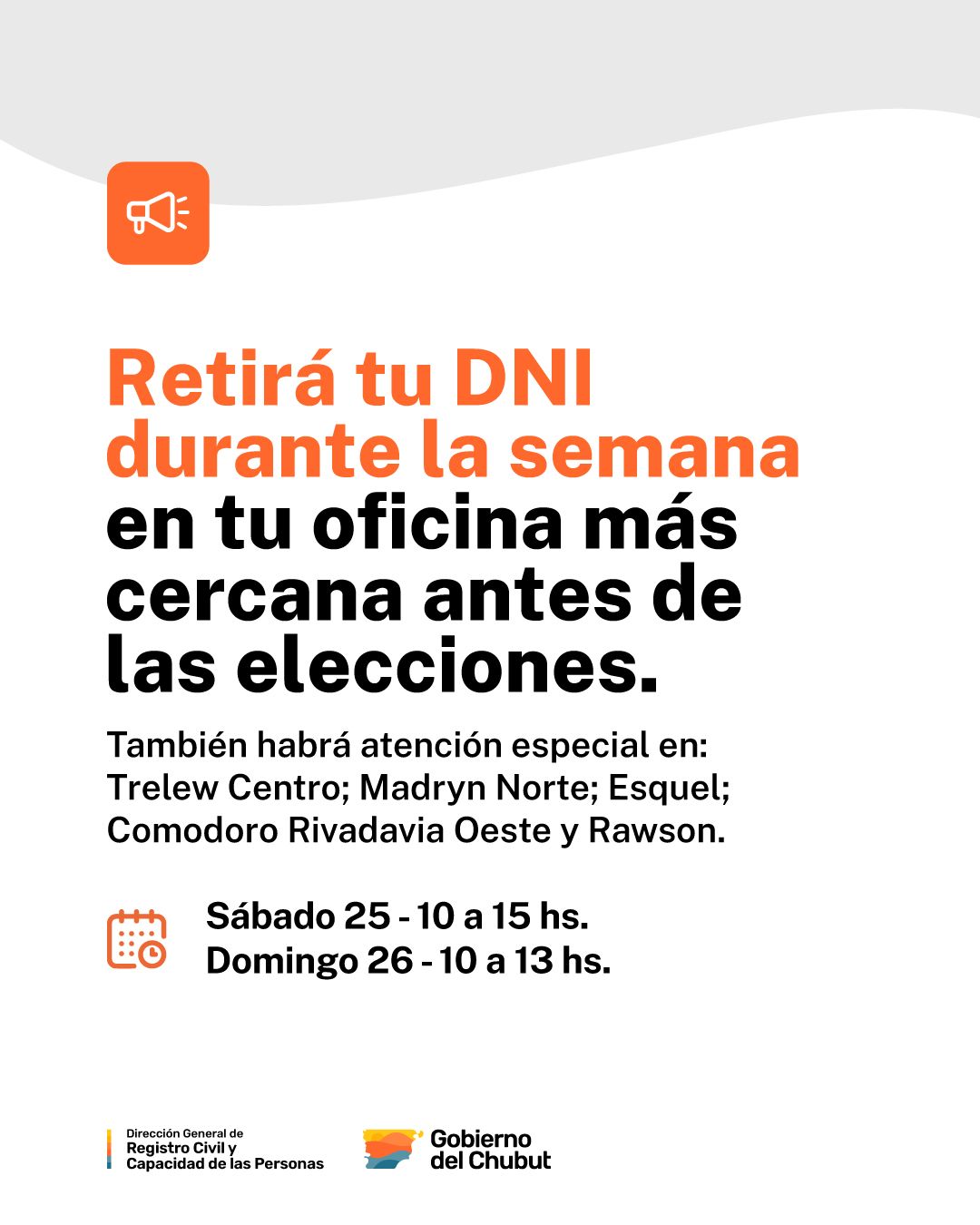 Con el objetivo de que todos los ciudadanos cuenten con su documento vigente antes de las elecciones de este domingo 26 de octubre, el Gobierno del Chubut, a través del Ministerio de Gobierno, recuerda que quienes hayan tramitado su DNI pueden retirarlo durante esta semana en las distintas delegaciones del Registro Civil de la provincia.