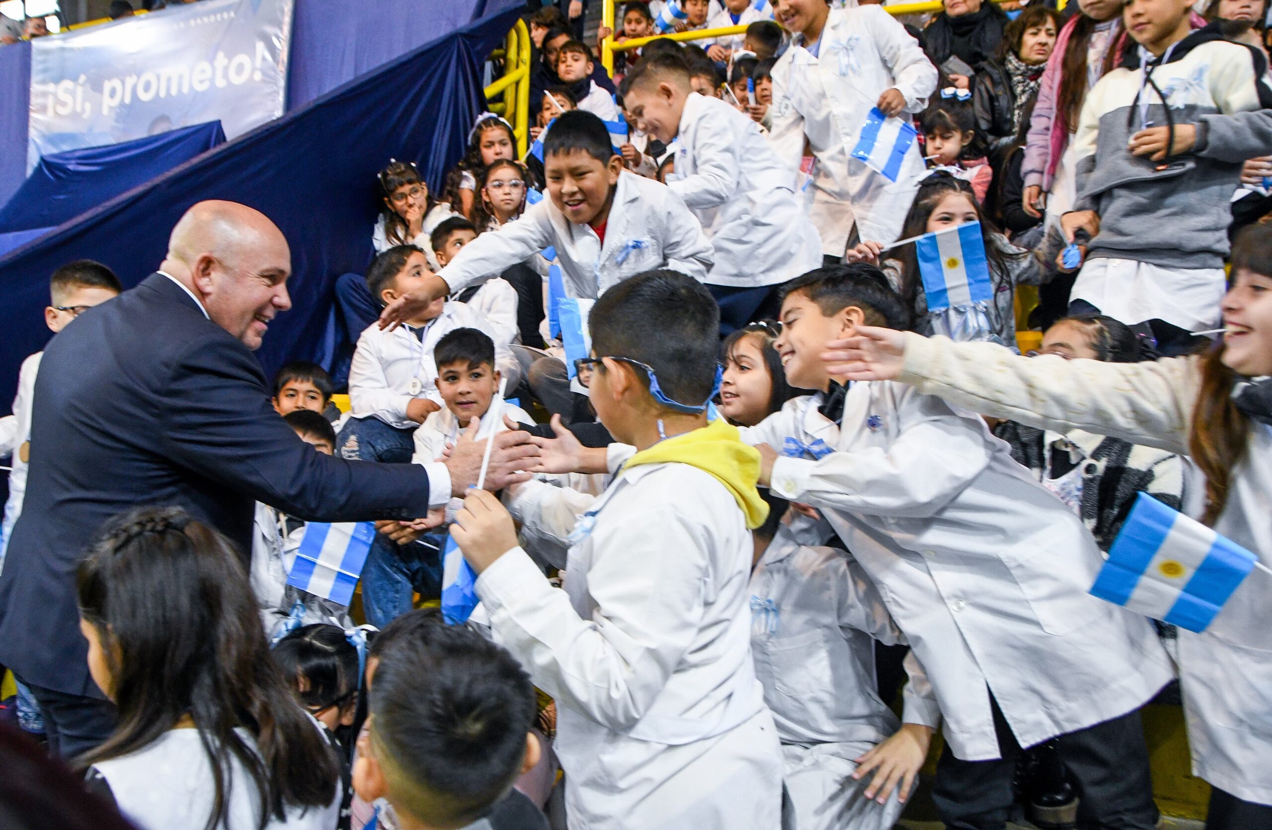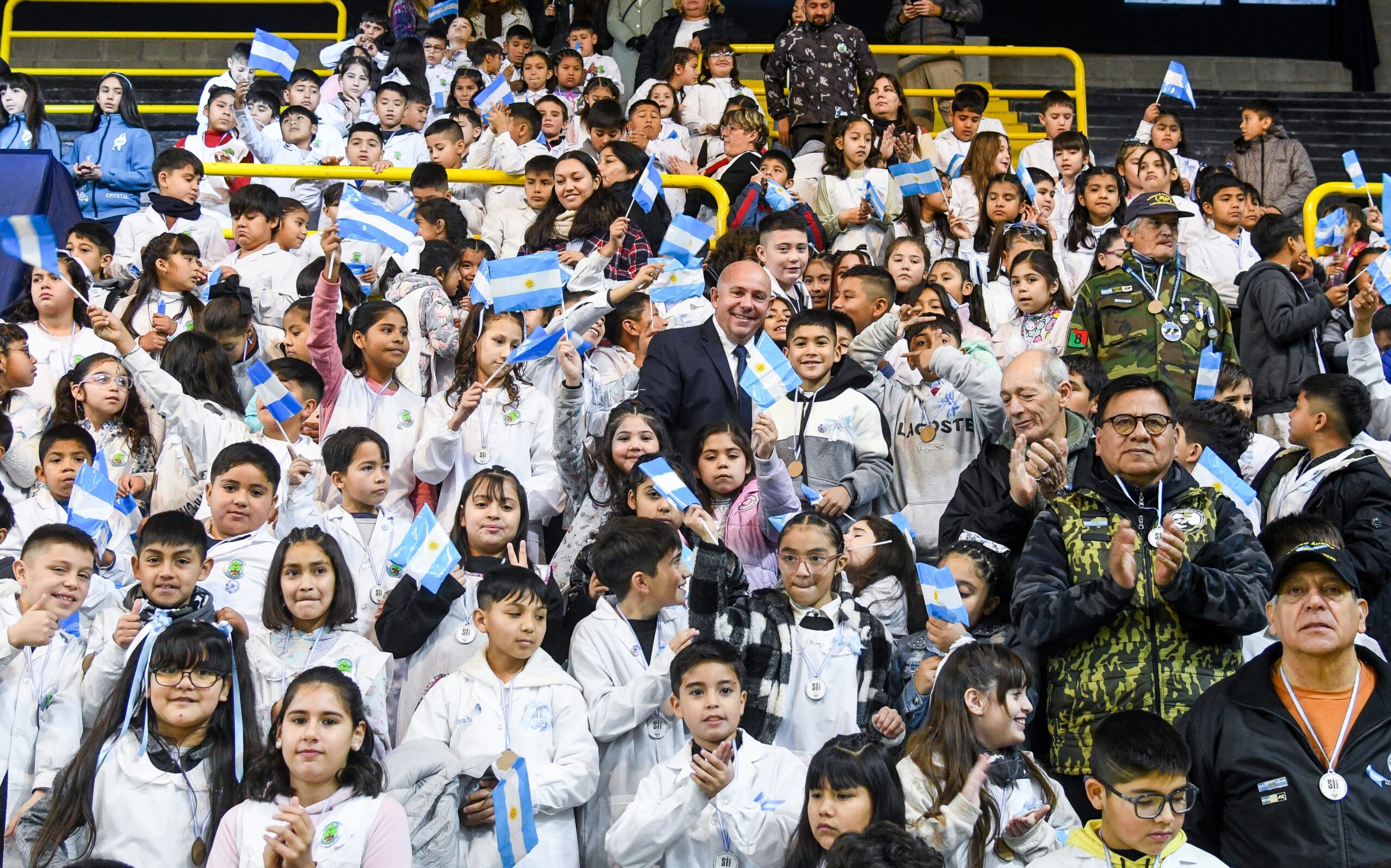 Ante un extraordinario marco de público en el gimnasio “Luján Barrientos”, dentro del Club Social y Deportivo Madryn, más de 500 estudiantes de escuelas municipales y provinciales realizaron su promesa de lealtad a la Bandera Argentina, recordando al general Manuel Belgrano.