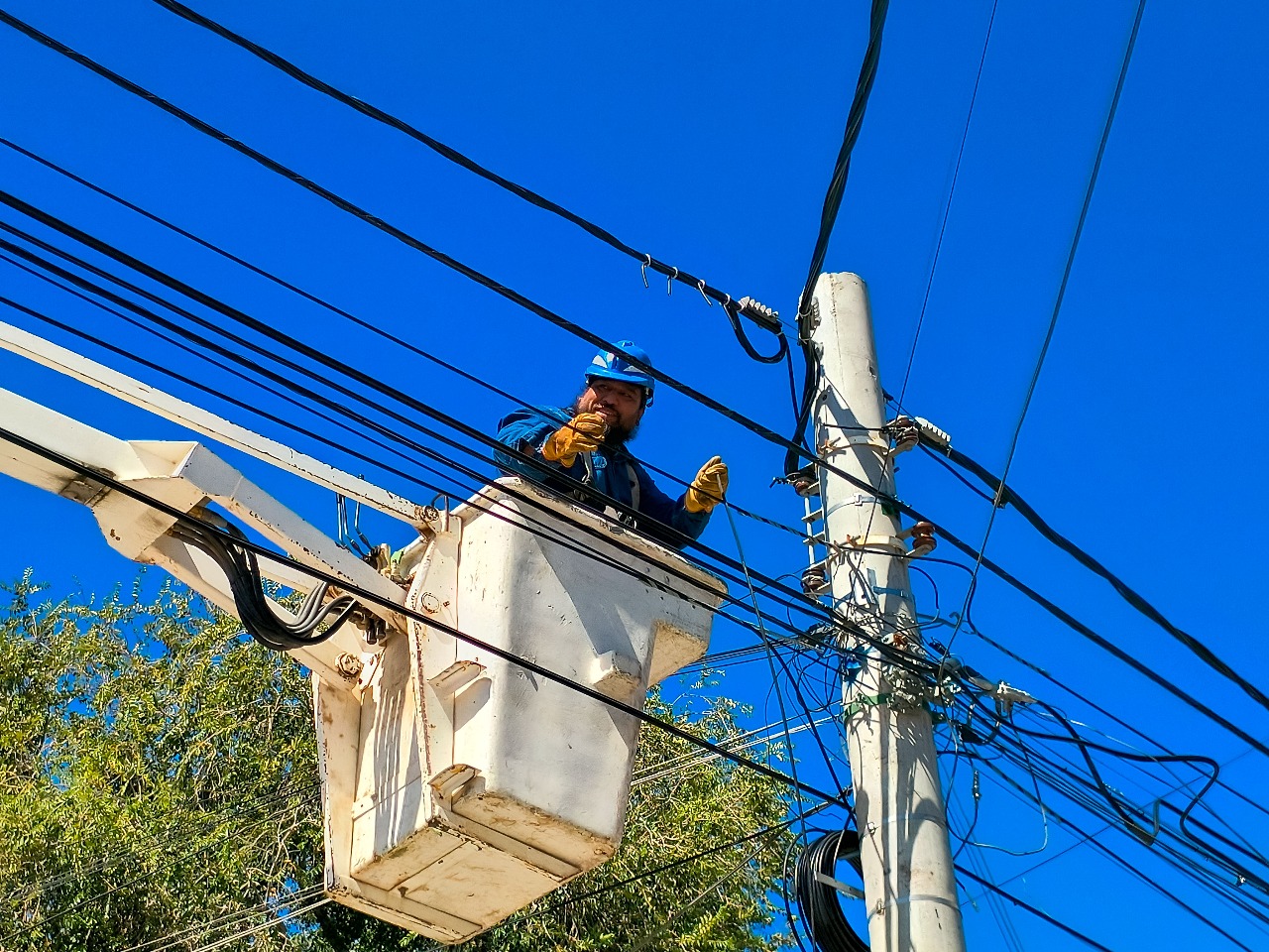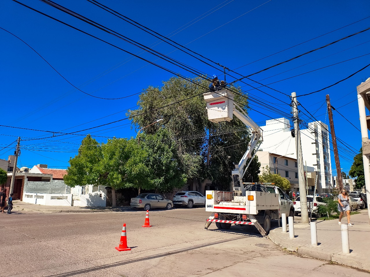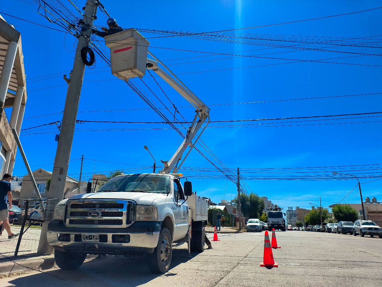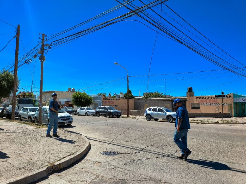 Luego de realizado el tendido de nuevas redes y vinculadas las conexiones domiciliarias a la nueva red. Nuestro personal de Energía, lleva adelante el retiro de las antiguas líneas convencionales, sobre la calle España entre Marcos A. Zar y San Martín.