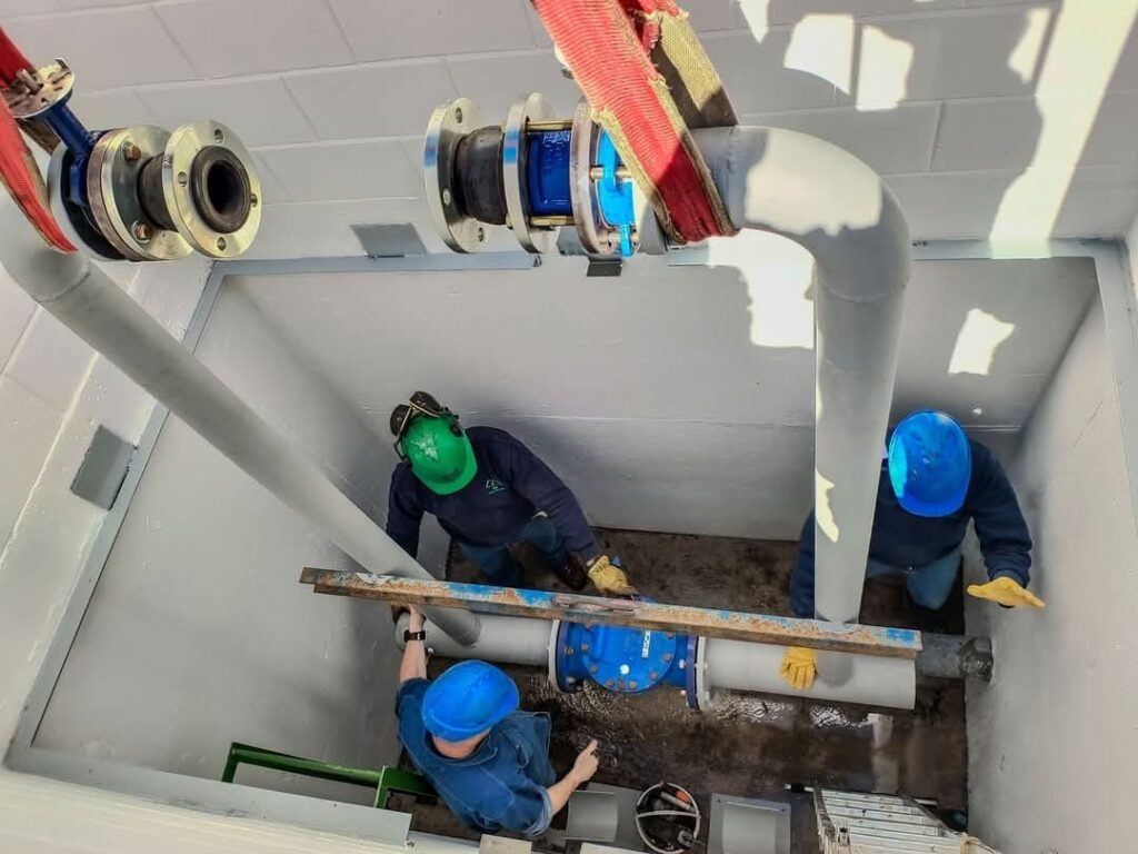 En primer lugar se realiza la purga de la nueva red y se controlan las unidades de turbiedad y los sólidos disueltos totales (TDS), lo cual certifica la efectividad del purgue. Luego mediante la inyección controlada de Hipocloríto de sodio al 100%, se lleva adelante la desinfección, por un lapso de 48 horas y una vez transcurrido ese lapso, nuevamente se purgar la cañería y se controla el agua hasta que los parámetros de hipoclorito se reduzcan hasta los niveles óptimos establecidos por el Código Alimentario Argentino. Finalizado este proceso, se da ingreso al sistema de las nuevas cañerías de agua potable.