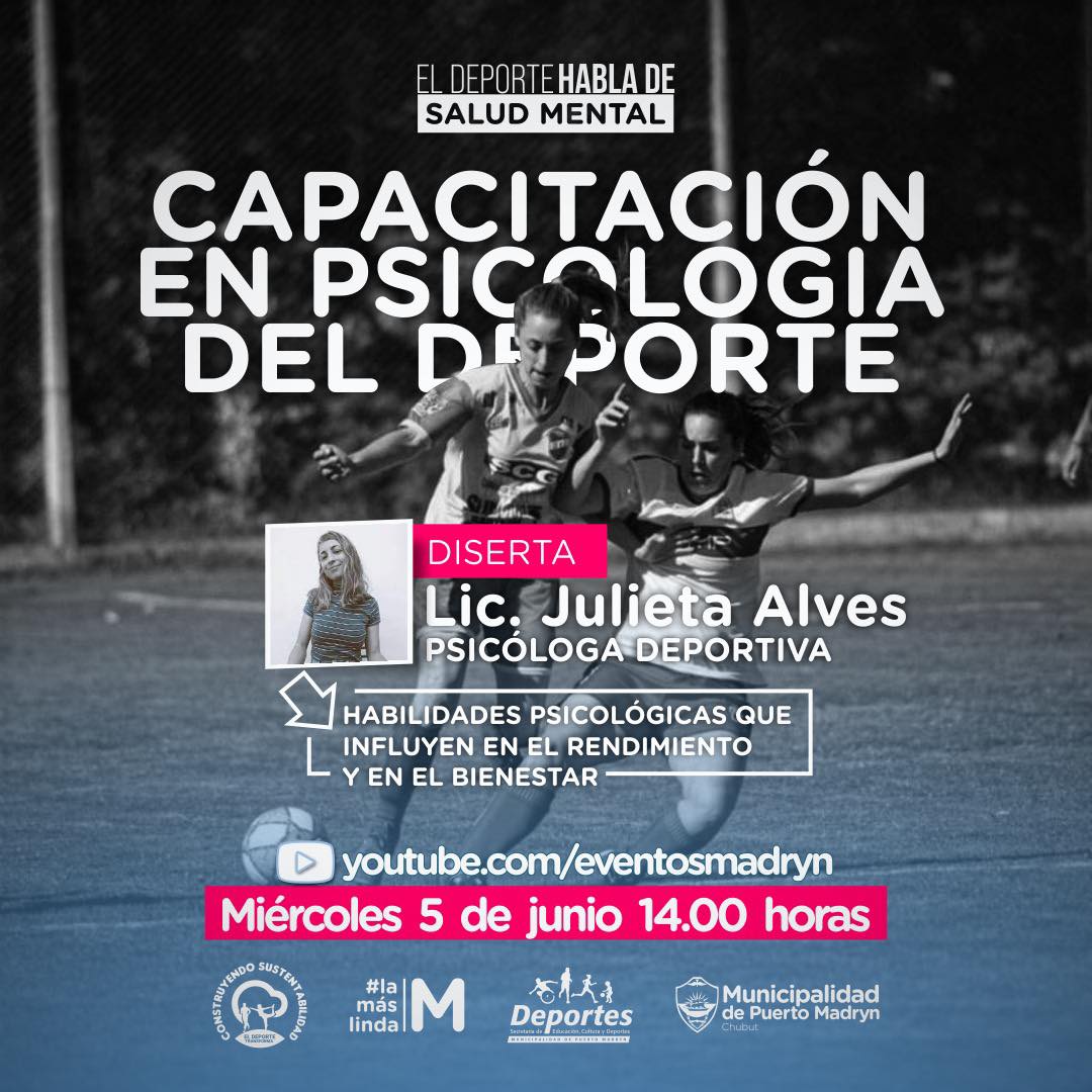 En el marco del programa «El deporte habla de salud mental», la Secretaría de Educación, Cultura y Deportes del Municipio realizará una capacitación virtual a cargo de la psicóloga deportiva, Julieta Alves. La actividad será el miércoles 5 de junio a las 14 horas y la charla estará disponible en vivo a través del canal de YouTube eventos madryn.
