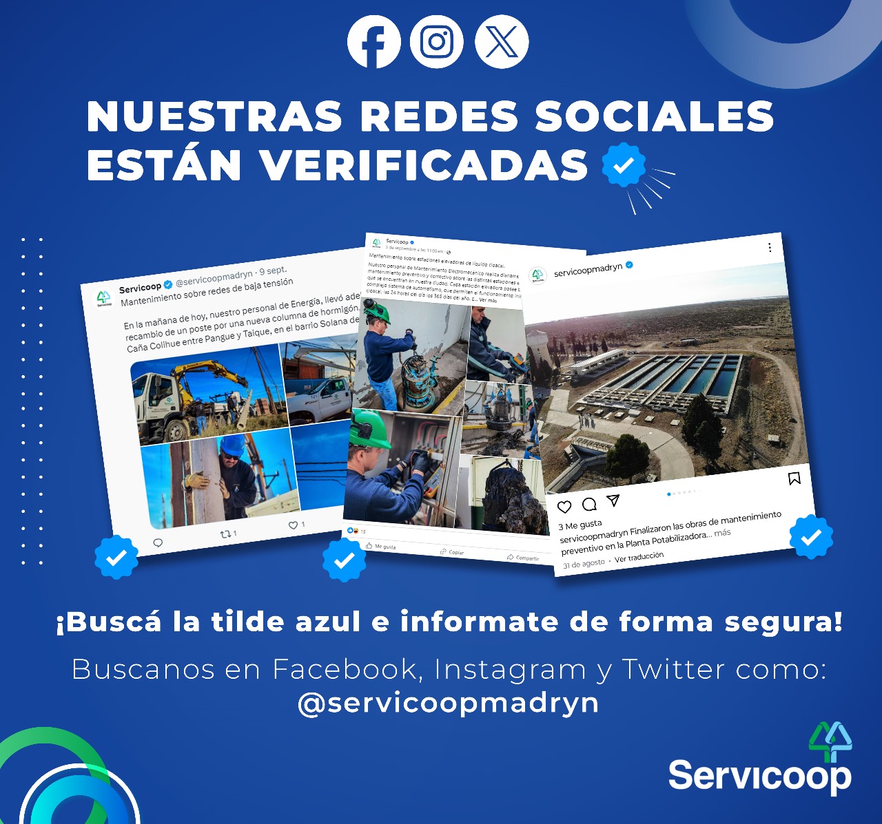 Toda la información sobre la Cooperativa y la actualidad de los servicios, la podes encontrar en www.servicoop.com y también en nuestras redes sociales, buscanos como @servicoopmadryn. Para evitar información falsa y prevenir estafas, nuestras redes sociales están verificadas, buscá la tilde azul e informate de forma segura.