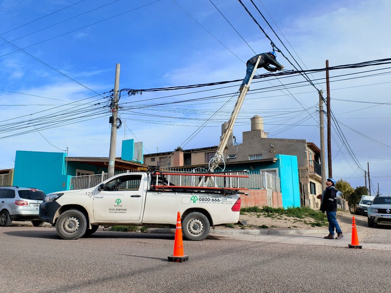 Una de las principales tareas del personal de Reclamos Eléctricos, ante alguna eventualidad o anormalidad en la prestación del servicio de energía, es la inspección de las redes de distribución del sistema. En nuestra zona son frecuentes los días con presencia de viento y esto genera una acción constante de desgaste sobre la infraestructura y las redes, como en el caso de los puentes de redes en baja tensión. Estos puentes hermanan las fases del sistema eléctrico de baja tensión de forma perpendicular fundamentalmente en los cruces de calles y su función principal es dotar de mayor maniobrabilidad al sistema de distribución de energía.