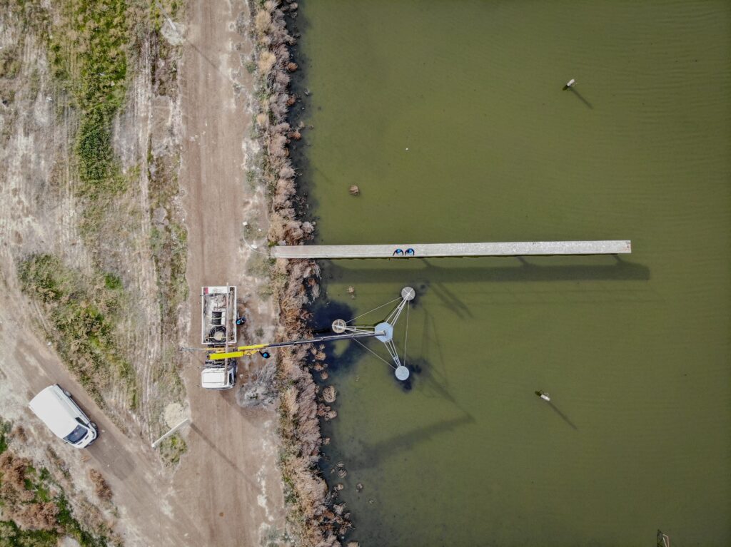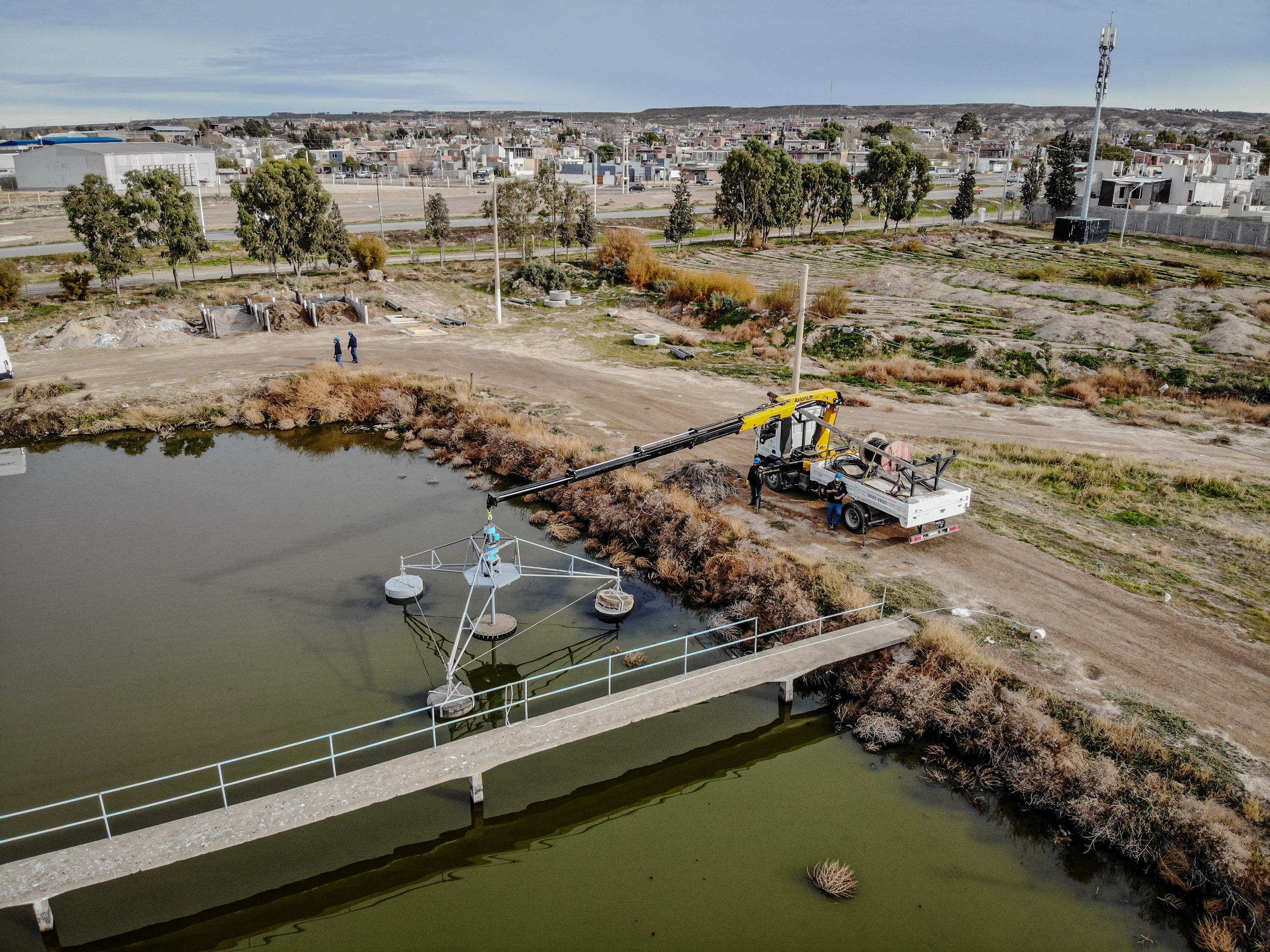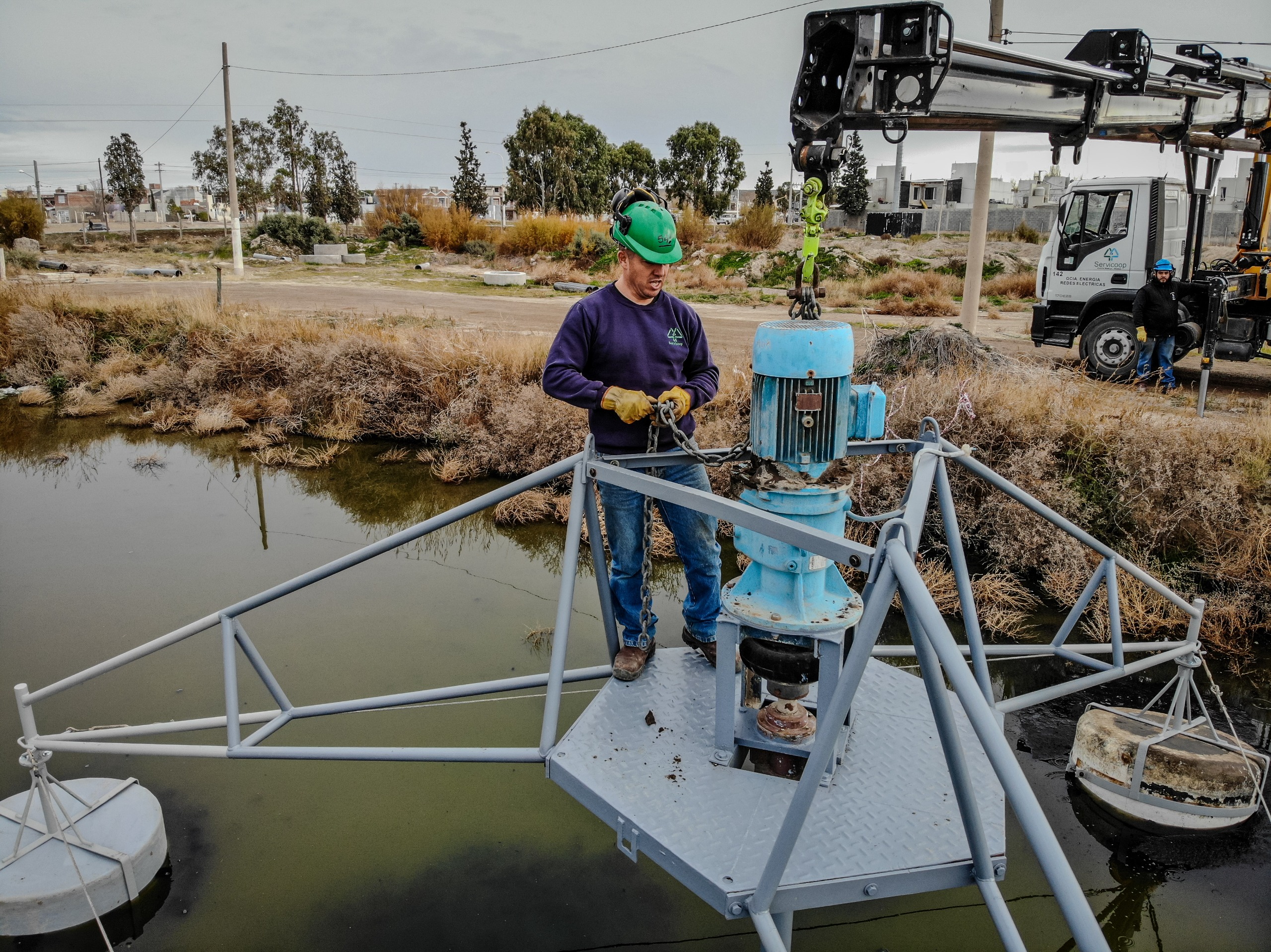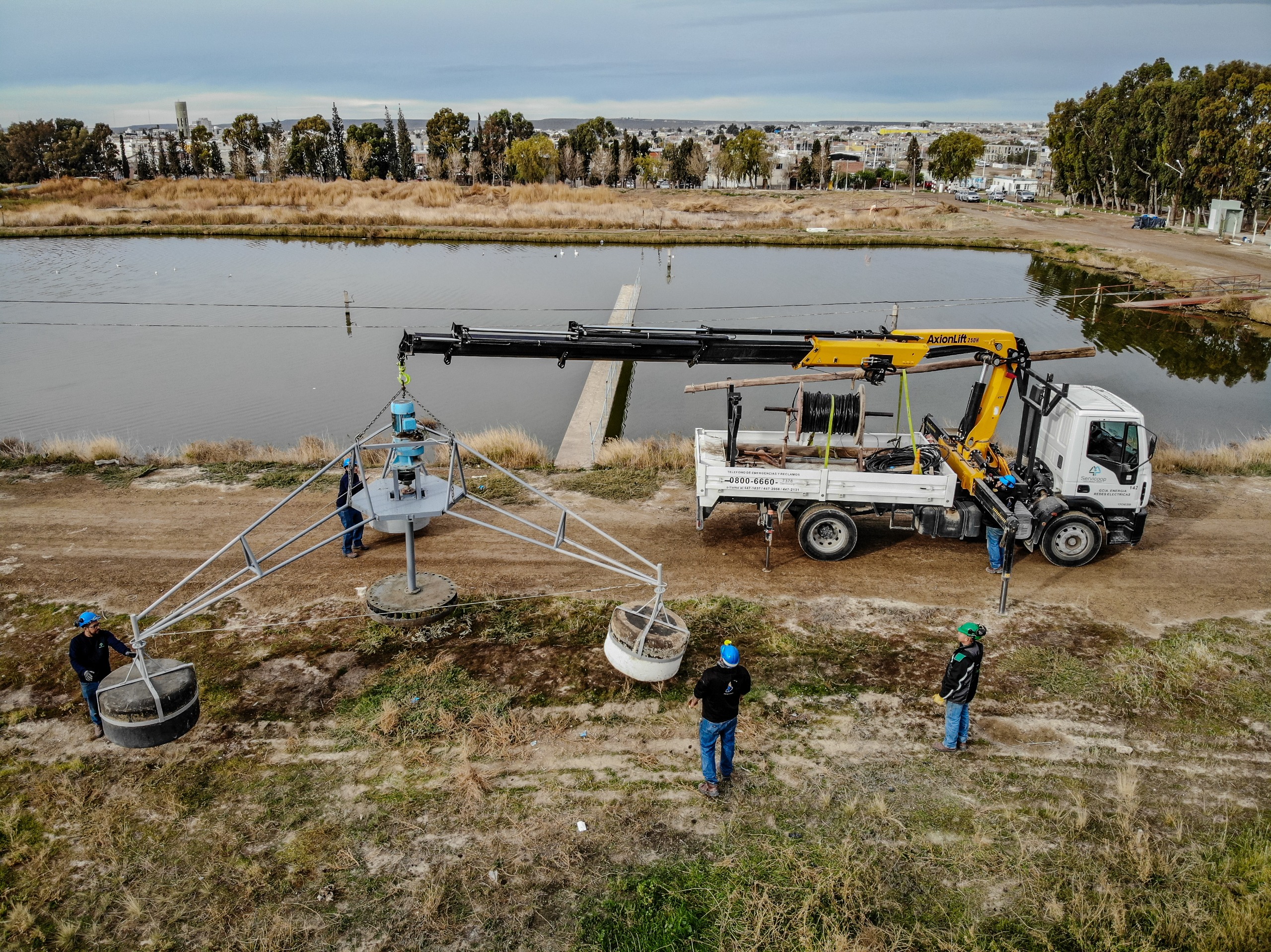 Nuestro personal de Mantenimiento Electromecánico, luego de finalizadas las tareas de mantenimiento y mejora sobre la estructura de los flotadores, procedió a la instalación de dicho aireador en la laguna de la Estación de Pretratamiento Centro.