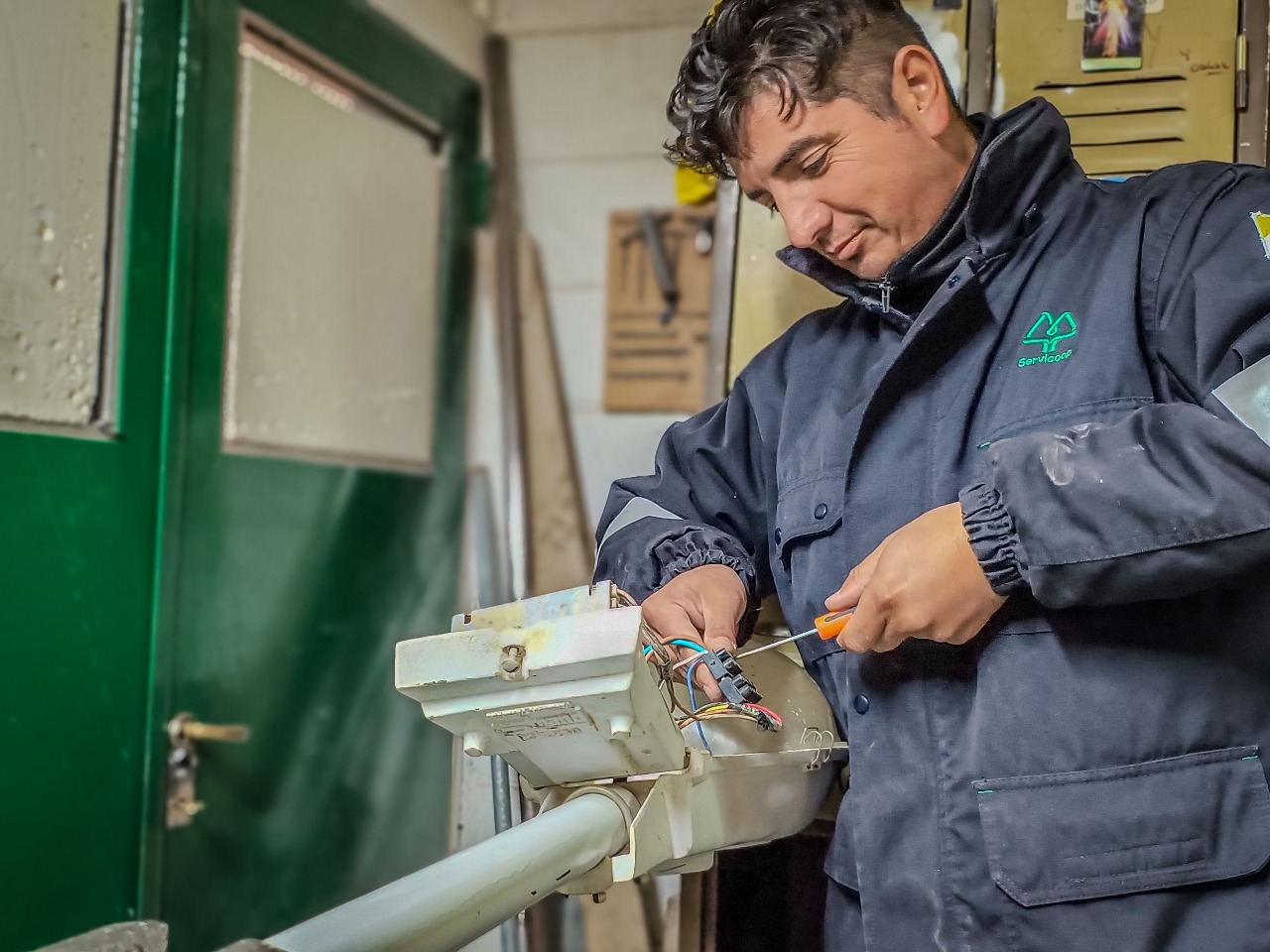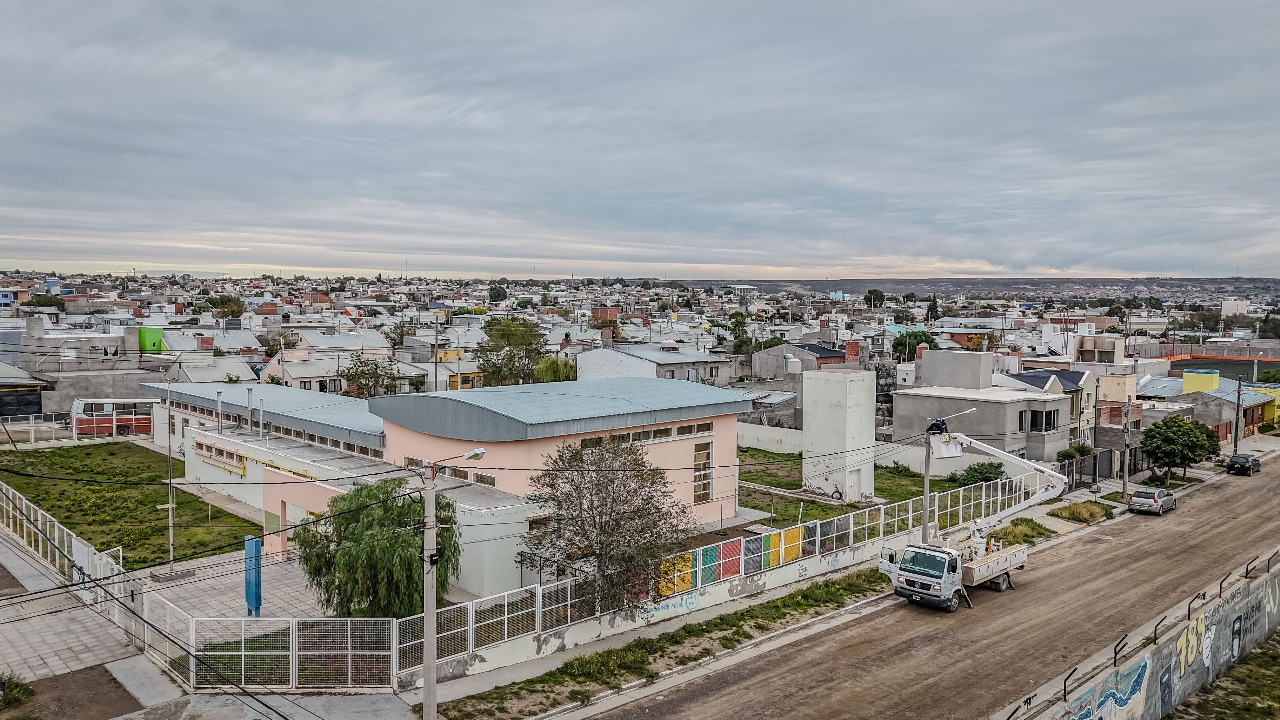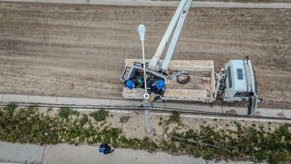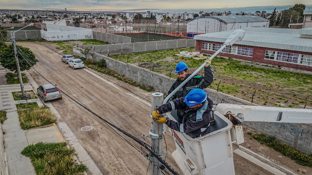 Luego de finalizada la instalación de nuevas columnas de hormigón y realizadas las obras de energía, nuestro personal de Alumbrado lleva adelante la readecuación e instalación de las luminarias pertenecientes al sistema de alumbrado público sobre la calle Neuquén, entre Alem y Villarino.