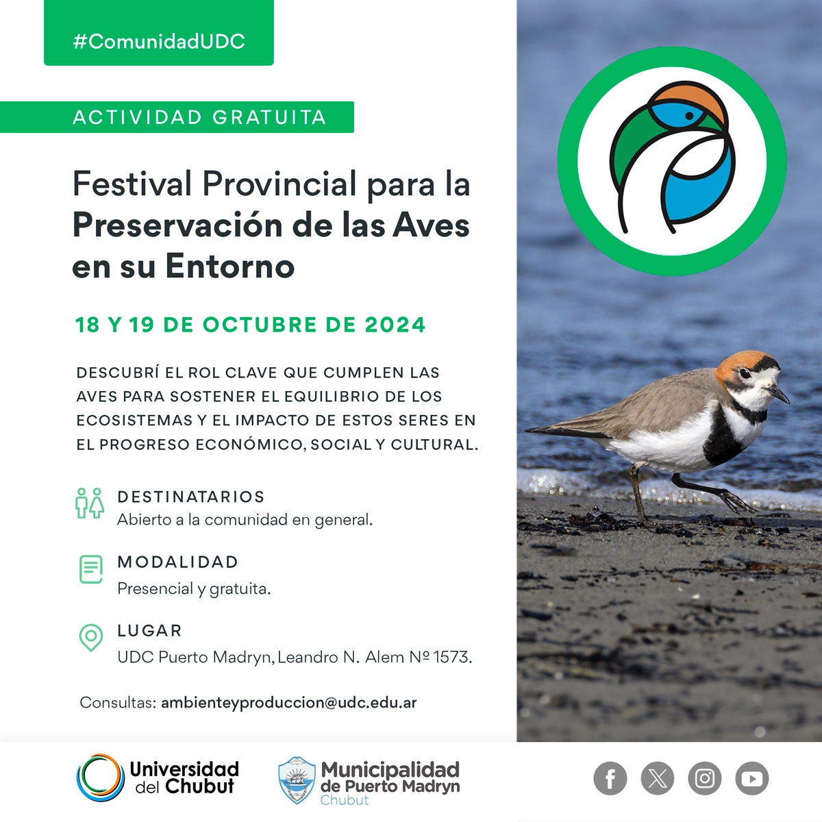 La Secretaría de Turismo de la Municipalidad de Puerto Madryn invita al “Festival Provincial para la Conservación de Aves y su Entorno” que organiza la Universidad del Chubut (UDC) y que se llevará a cabo el 18 y 19 de octubre dentro de la Extensión Áulica de la facultad, ubicada en Leandro N. Alem 1573.