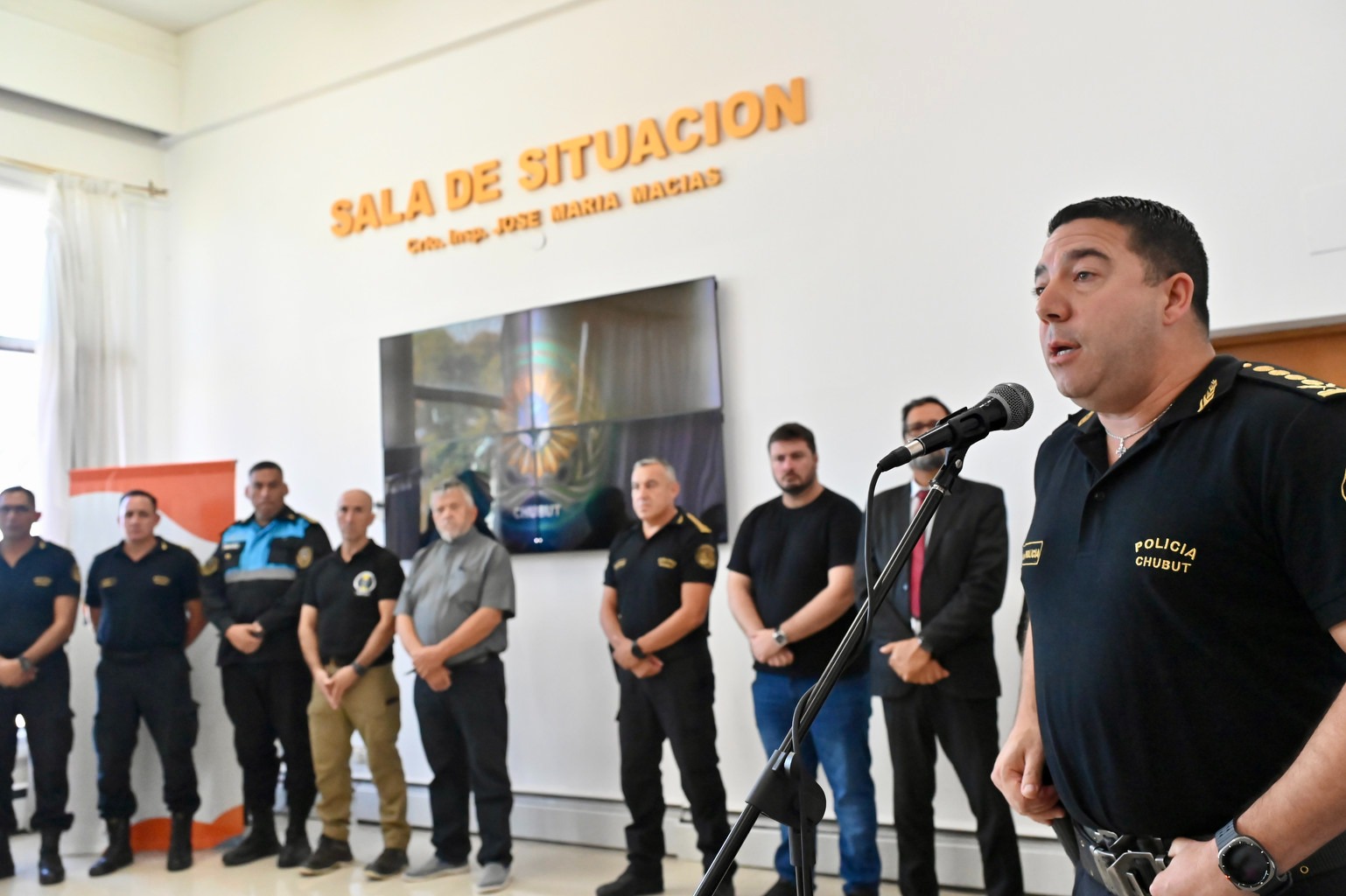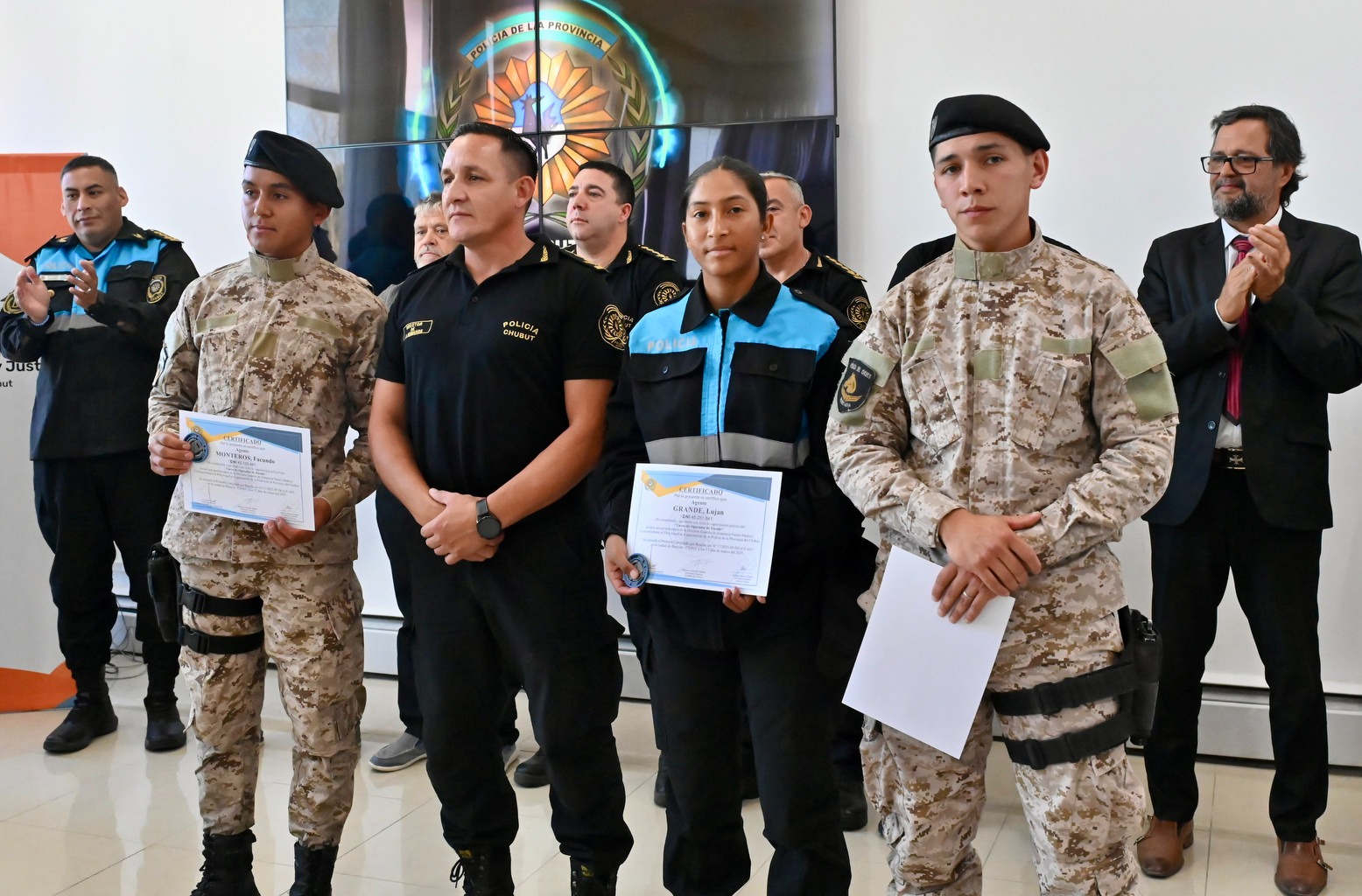 En representación del Ministerio de Seguridad y Justicia; el subsecretario de Justicia, Rodrigo Miquelarena, junto al jefe de la Policía del Chubut, Andrés García, encabezaron el acto que se llevó adelante en la Jefatura de Policía del Chubut en la ciudad de Rawson, asistiendo además los subsecretarios de Seguridad Vial, César Vargas; y de Protección Ciudadana, Eduardo Pérez; el subjefe de la fuerza provincial, Mauricio Zabala; directores de la Plana Mayor, jefes de áreas, responsables de las capacitaciones, entre otras autoridades y familiares de los cursantes.