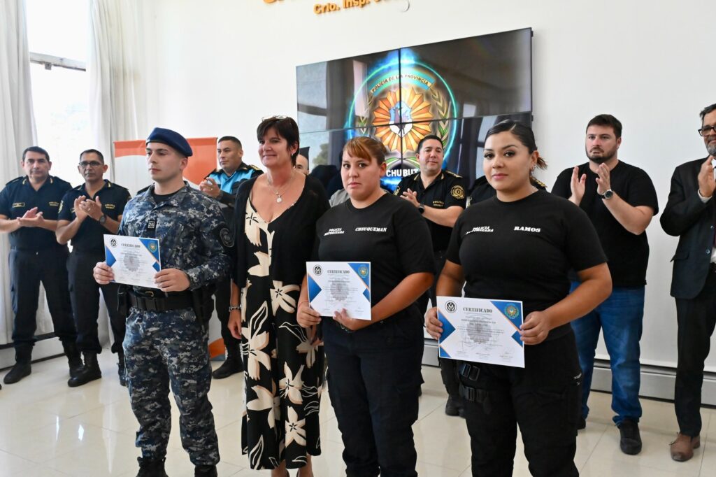 En el marco de las constantes capacitaciones del recurso humano que la gestión del gobernador Ignacio «Nacho» Torres viene realizando en toda la provincia, este miércoles efectivos de la Policía del Chubut recibieron los certificados correspondientes a los cursos de «Operador de Escudo» y de «Conducción de Moto-Vehículos Policiales GRIM».