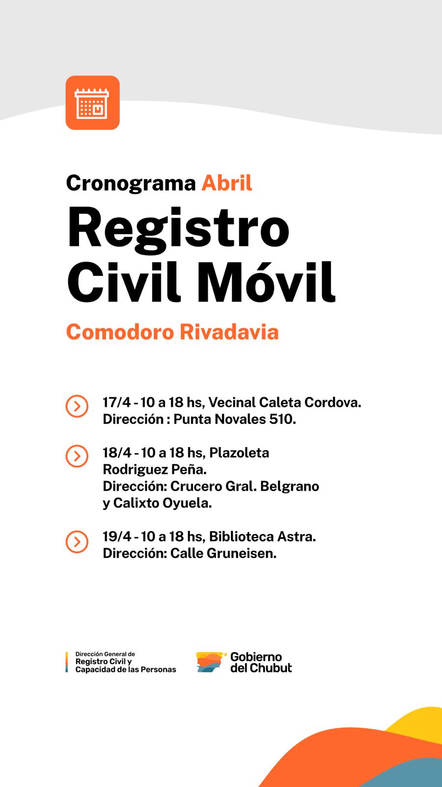 En este marco, el Ministerio de Gobierno de la provincia precisó que el operativo se desarrollará el viernes 17 de abril, de 10 a 18 horas, en la vecinal de Caleta Córdova, ubicada en Punta Novales 510.