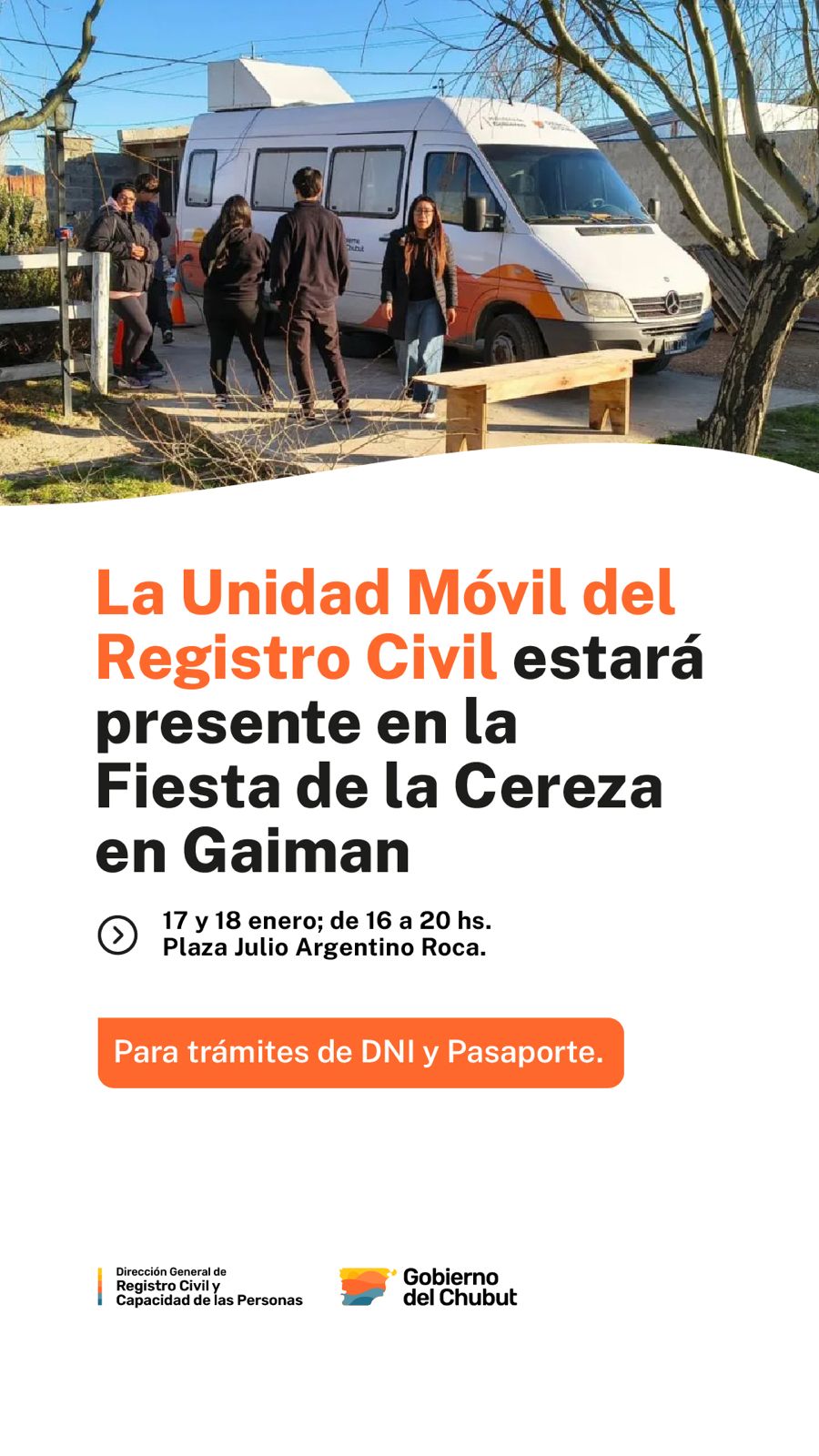 El Gobierno del Chubut, a través del Ministerio de Gobierno del Chubut, informa que la Unidad Móvil de Documentación del Registro Civil estará presente durante la Fiesta de la Cereza, que se realizará este fin de semana en Gaiman, con el objetivo de facilitar el acceso a trámites de documentación a los vecinos que asistan al evento.
