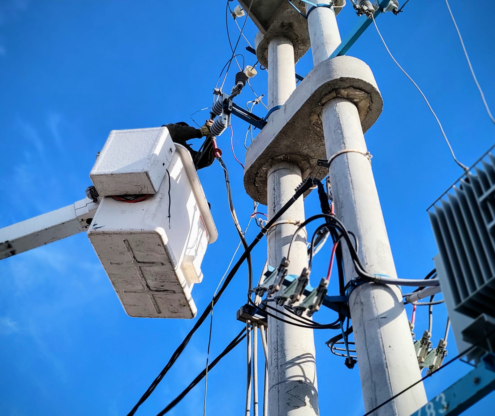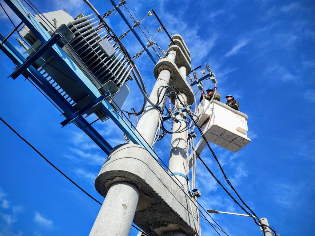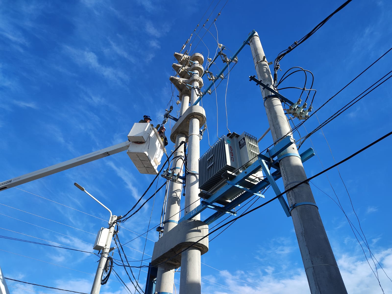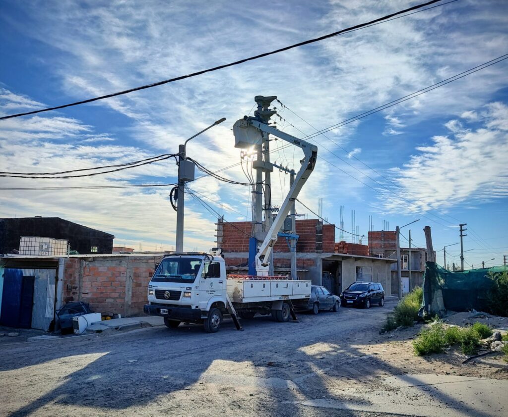 En inmediaciones de las calles Tecka y Av. Eva Perón, se llevan adelante tareas de mantenimiento preventivo sobre los fusibles pertenecientes a las redes de media tensión. Está tarea aporta mayor estabilidad al sistema de distribución de energía y disminuye los cortes imprevistos del servicio.