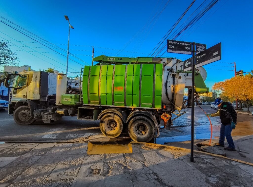 En la mañana de hoy, nuestro personal de Saneamiento realizó tareas de mantenimiento y desobstrucción del colector, sobre la boca de registro ubicada en la intersección de las calles: H. Yrigoyen y Fontana.