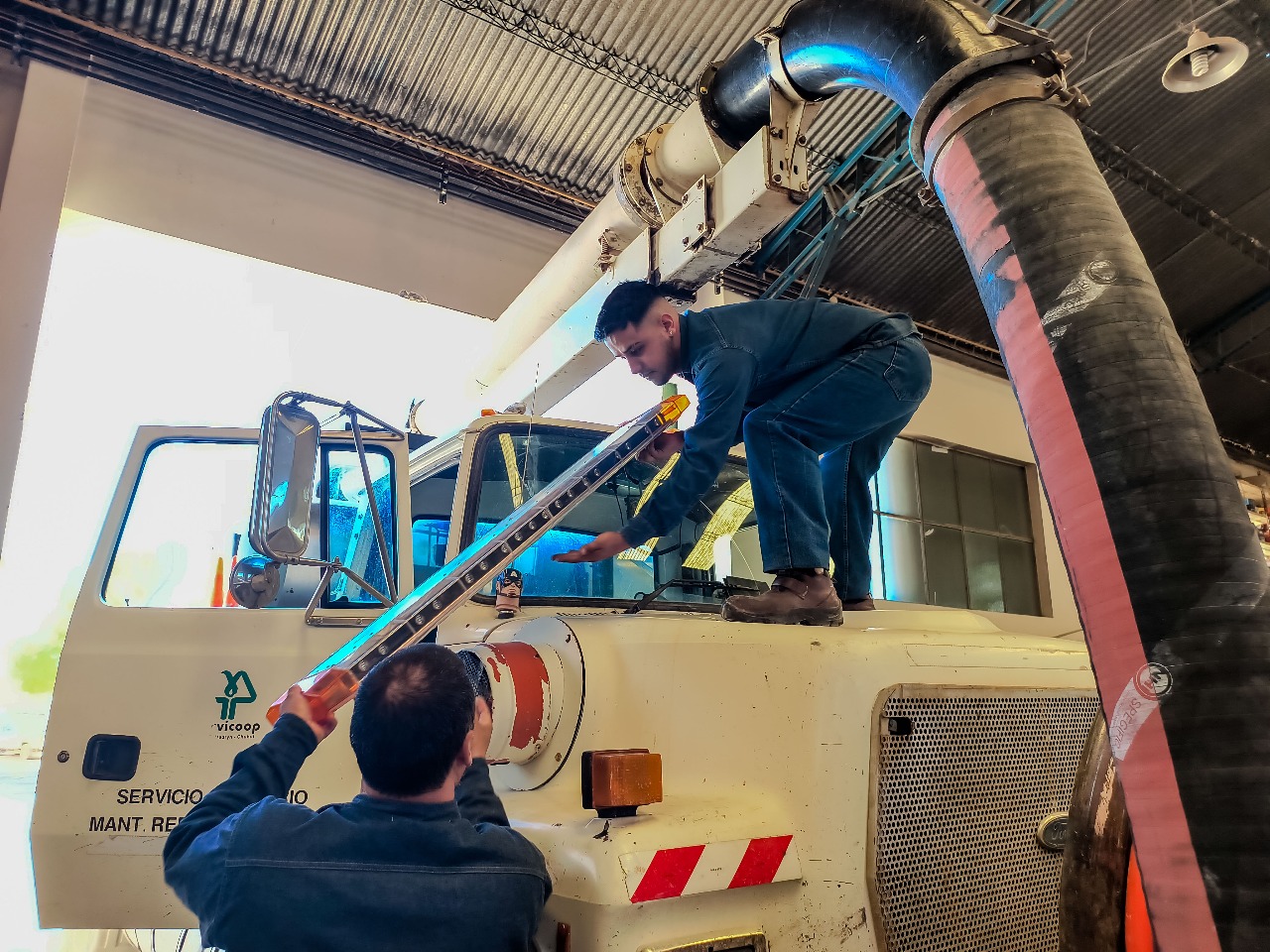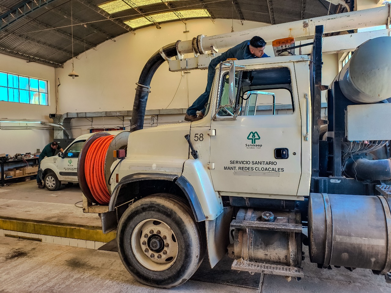Nuestro personal del Taller Mecánico realiza mantenimiento preventivo y correctivo, sobre la totalidad de vehículos, con los que cuenta la Cooperativa. En esta oportunidad, se ejecutó la instalación de una nueva barra estrobo de balizas para un camión del servicio de Saneamiento, como también el servicio de fluidos y chequeos en general.