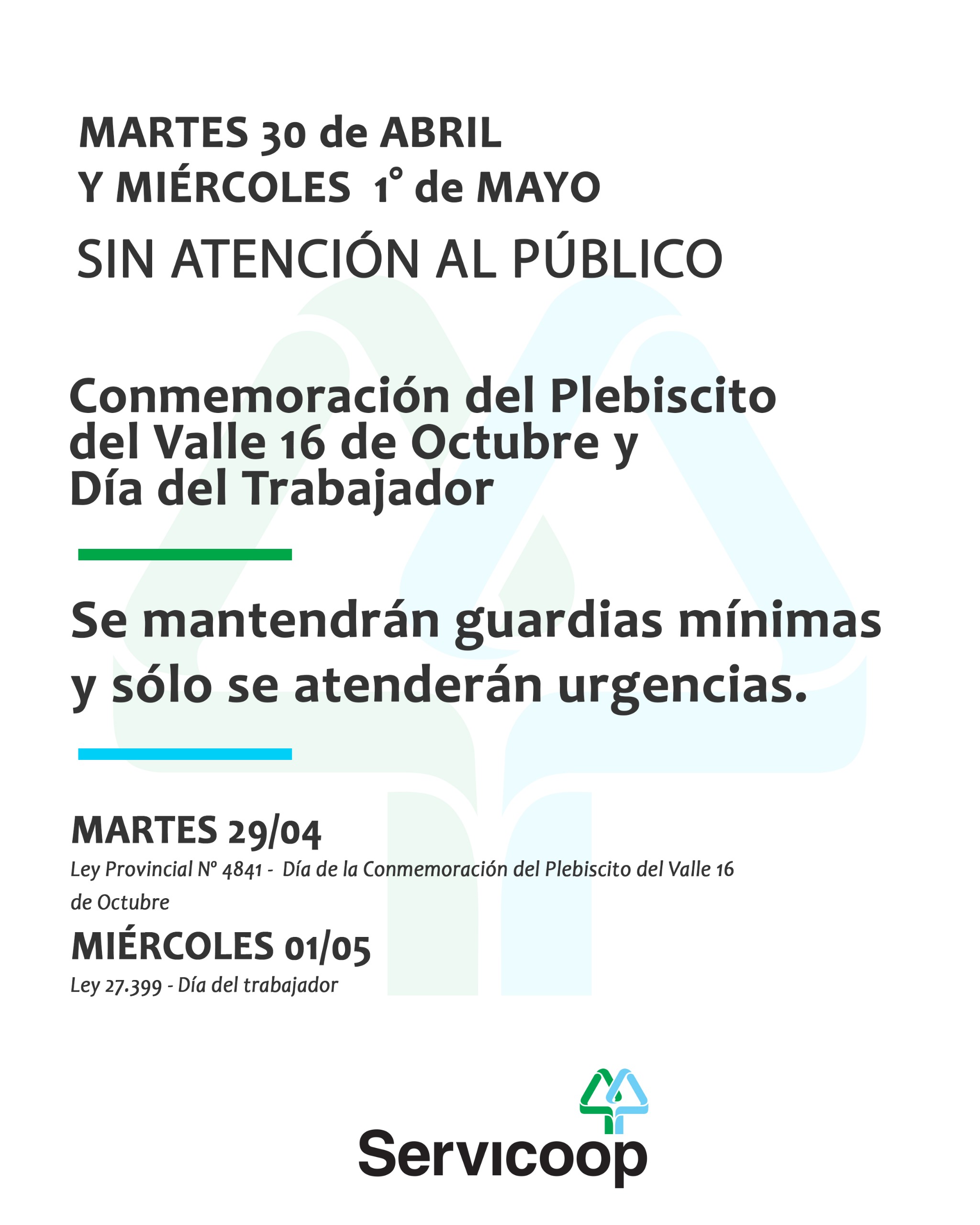 Informamos a la comunidad, que el próximo martes y miércoles, nuestras oficinas permanecerán cerradas debido a los feriados del 30 de abril y 1° de Mayo respectivamente. Se mantendrán en operaciones las guardias técnicas mínimas y solo se atenderán urgencias.