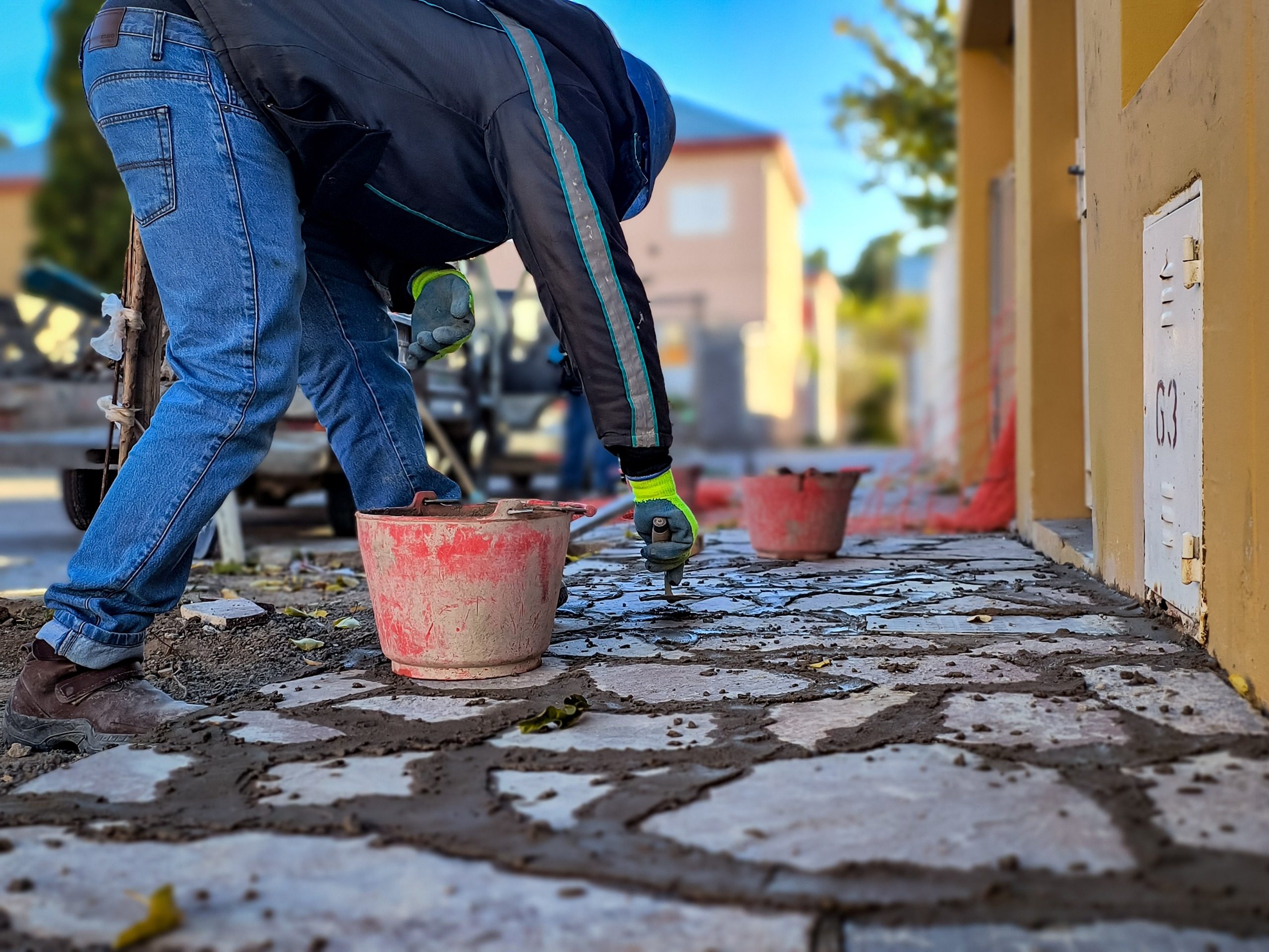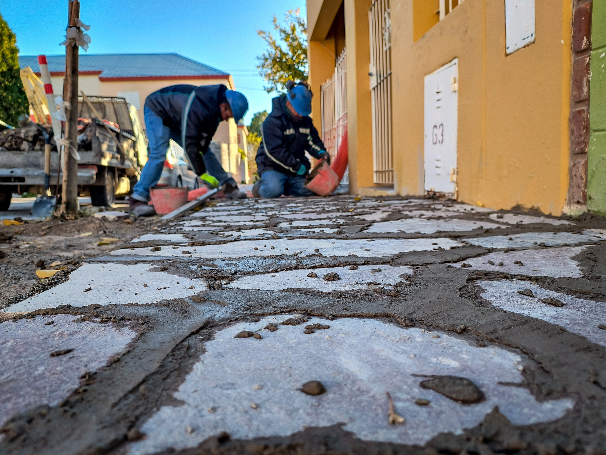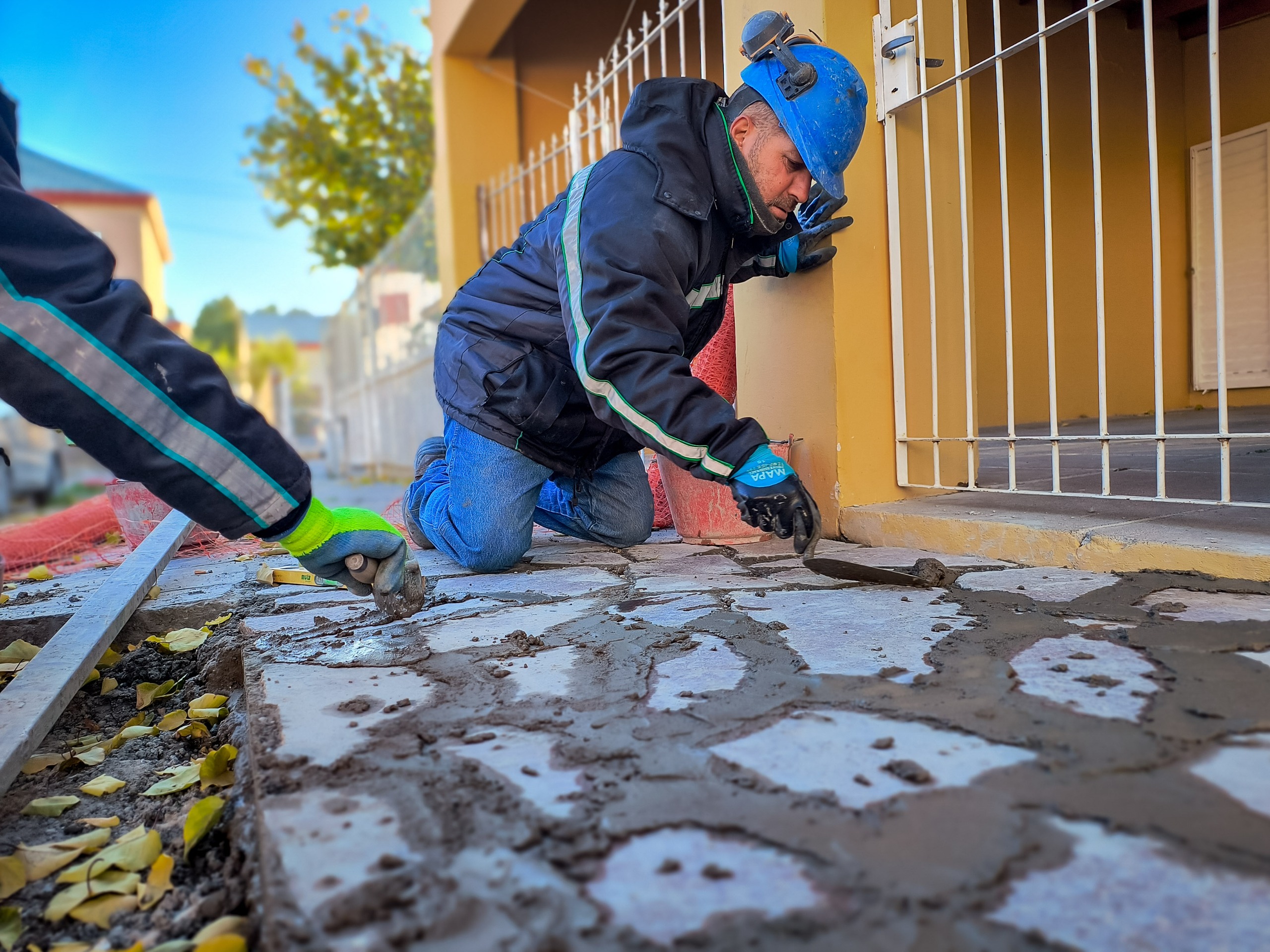 Nuestro personal de Servicios Auxiliares, dependiente de la Gcia. de Agua y Saneamiento, lleva adelante la reconstrucción de veredas, las cuales debieron ser intervenidas para realizar reparaciones sobre el servicio de agua potable, en el B° Comercio I, en inmediaciones de la calle R. Arlt.