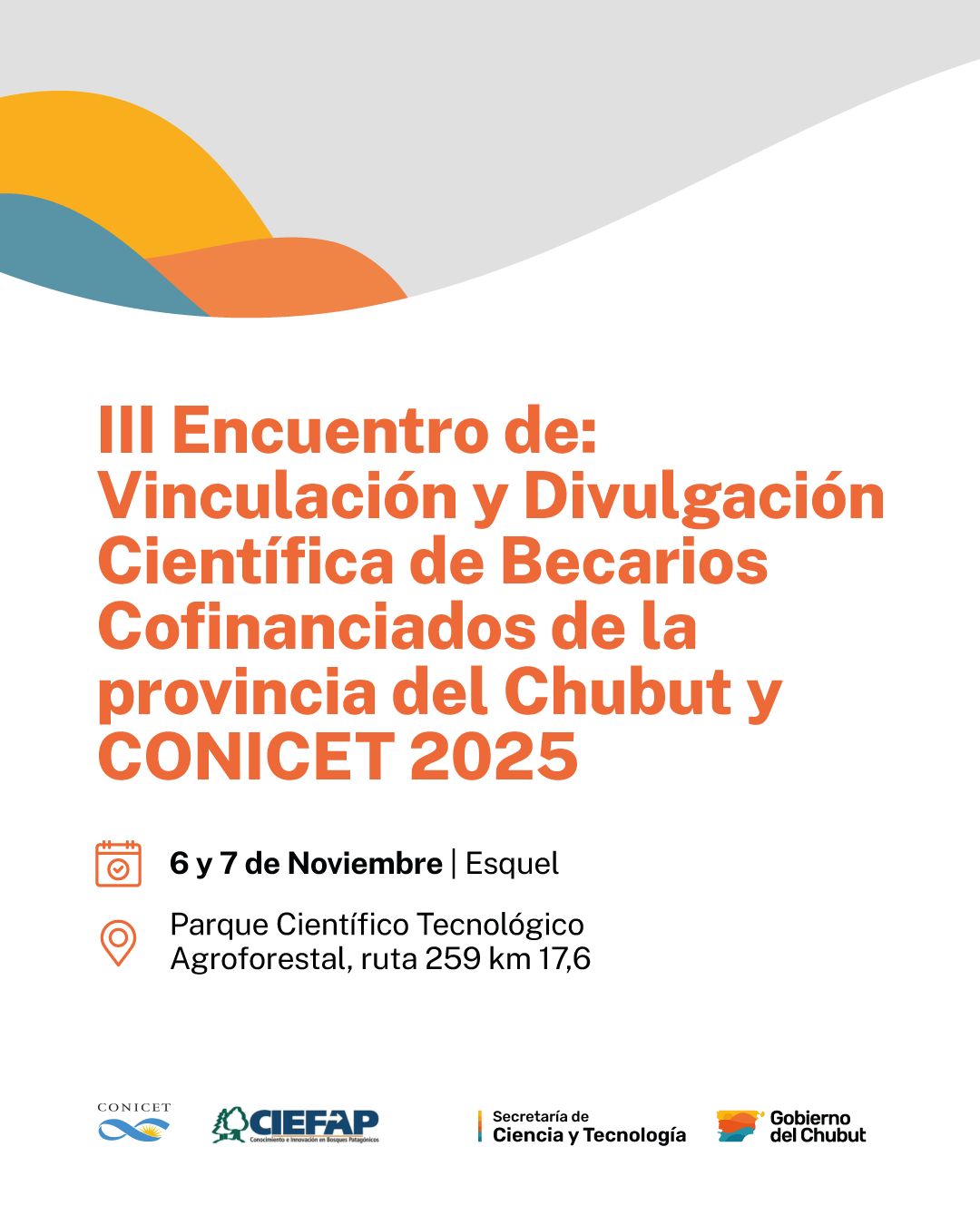 El Gobierno del Chubut, que conduce Ignacio “Nacho” Torres, invita a través de la Secretaría de Ciencia y Tecnología al III Encuentro de Vinculación y Divulgación Científica de Becarios Cofinanciados, que se realizará los días 6 y 7 de noviembre en el Parque Científico Tecnológico Agroforestal, ubicado sobre la ruta 259 km 17,6, en la ciudad de Esquel.