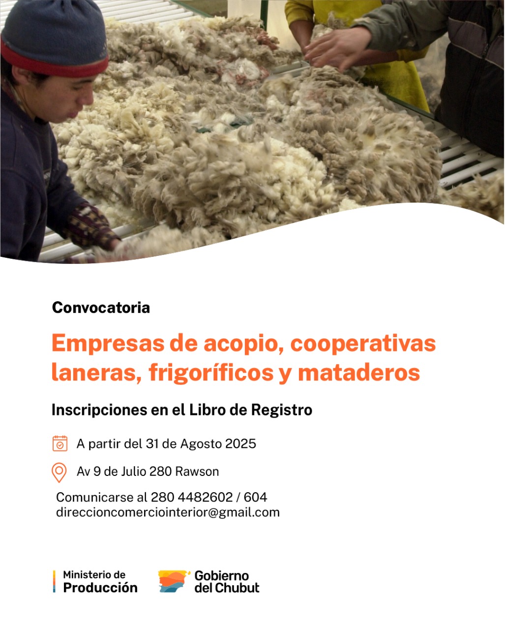 El Gobierno del Chubut, a través del Ministerio de Producción y la Dirección de Comercio Interior de la provincia, convoca a empresas de acopio, cooperativas laneras, frigoríficos y mataderos a inscribirse en el Libro de Registro para el desarrollo de la actividad.