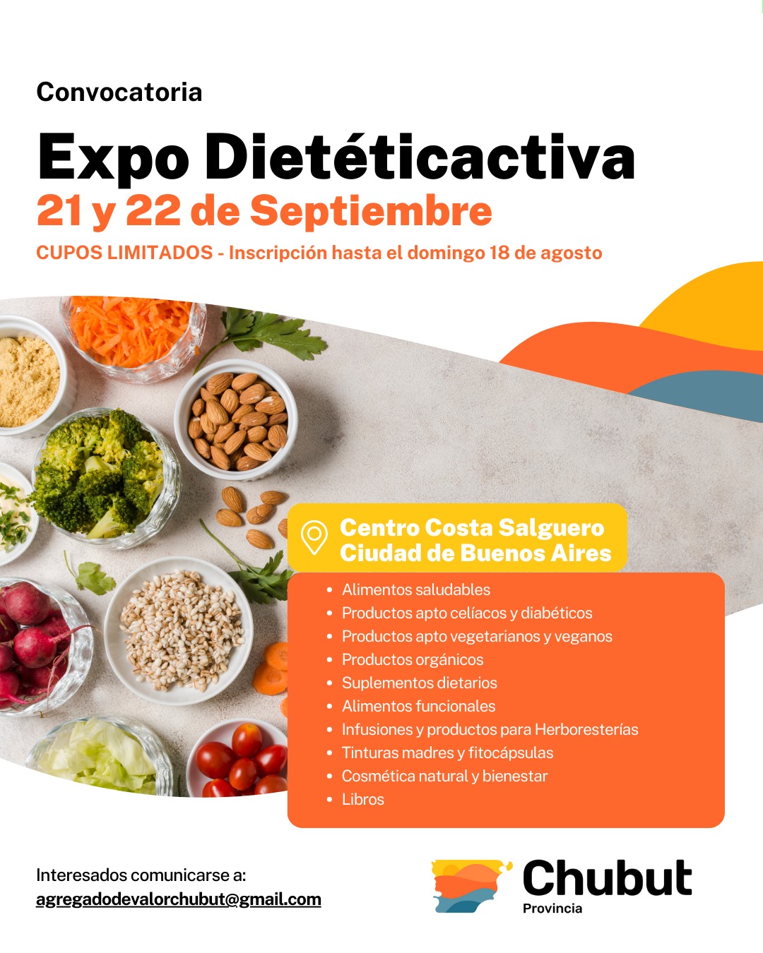 Contribuyendo a reforzar el apoyo a los chubutenses dedicados a un rubro en permanente expansión, el Gobierno de Chubut, que conduce Ignacio «Nacho» Torres, a través del Ministerio de Producción, invita a participar de la denominada «Retail Saludable Expo DietéticActiva», una exposición nacional que nuclea a referentes de dietéticas, laboratorios y droguerías, entre otros.