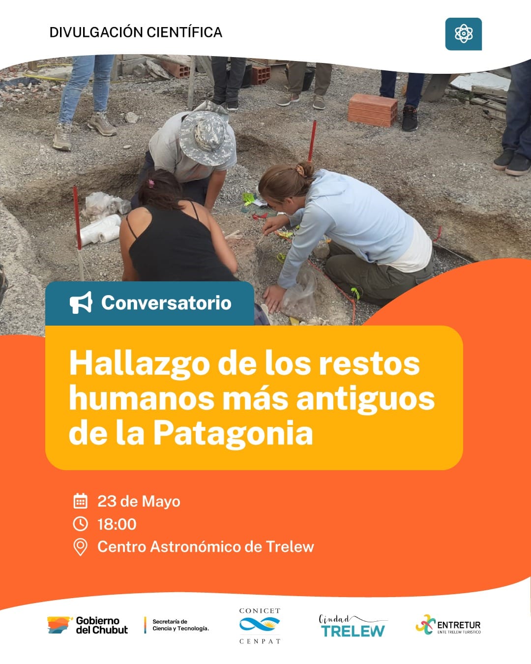 El Gobierno del Chubut, a través de la Secretaría de Ciencia y Tecnología, invita junto al CONICET – CENPAT y la Municipalidad de Trelew, a participar de la charla abierta de divulgación científica titulada «Revelando las huellas del pasado: los restos humanos más antiguos de la Patagonia”.