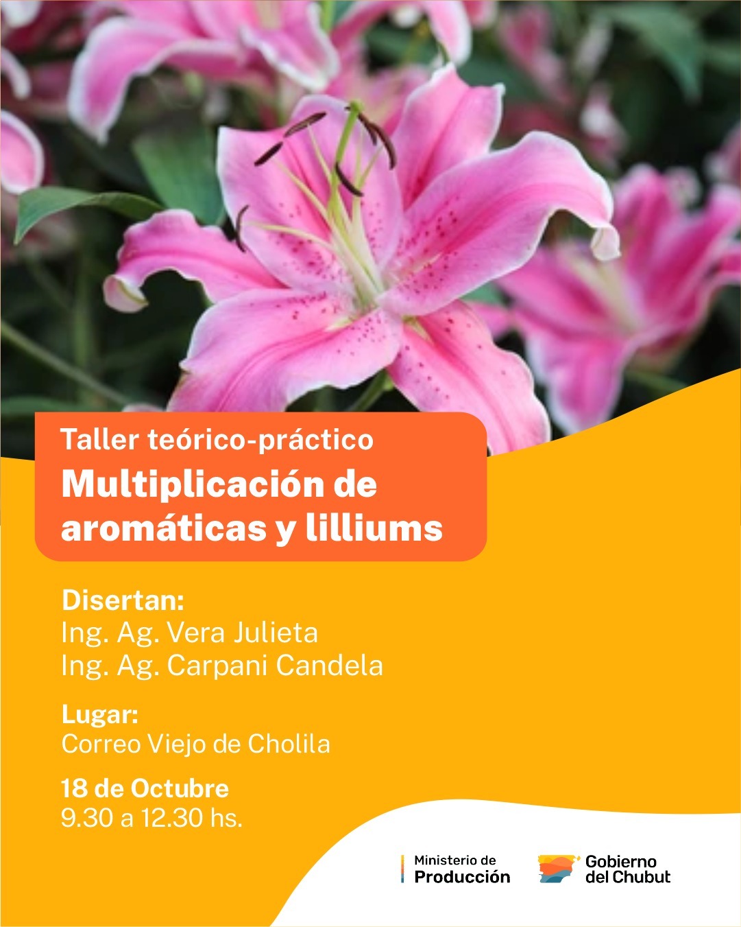 El Gobierno del Chubut, a través del Ministerio de Producción, llevará adelante el próximo viernes 18 de octubre en Cholila un taller teórico práctico sobre “multiplicación de plantas aromáticas y lilium”.