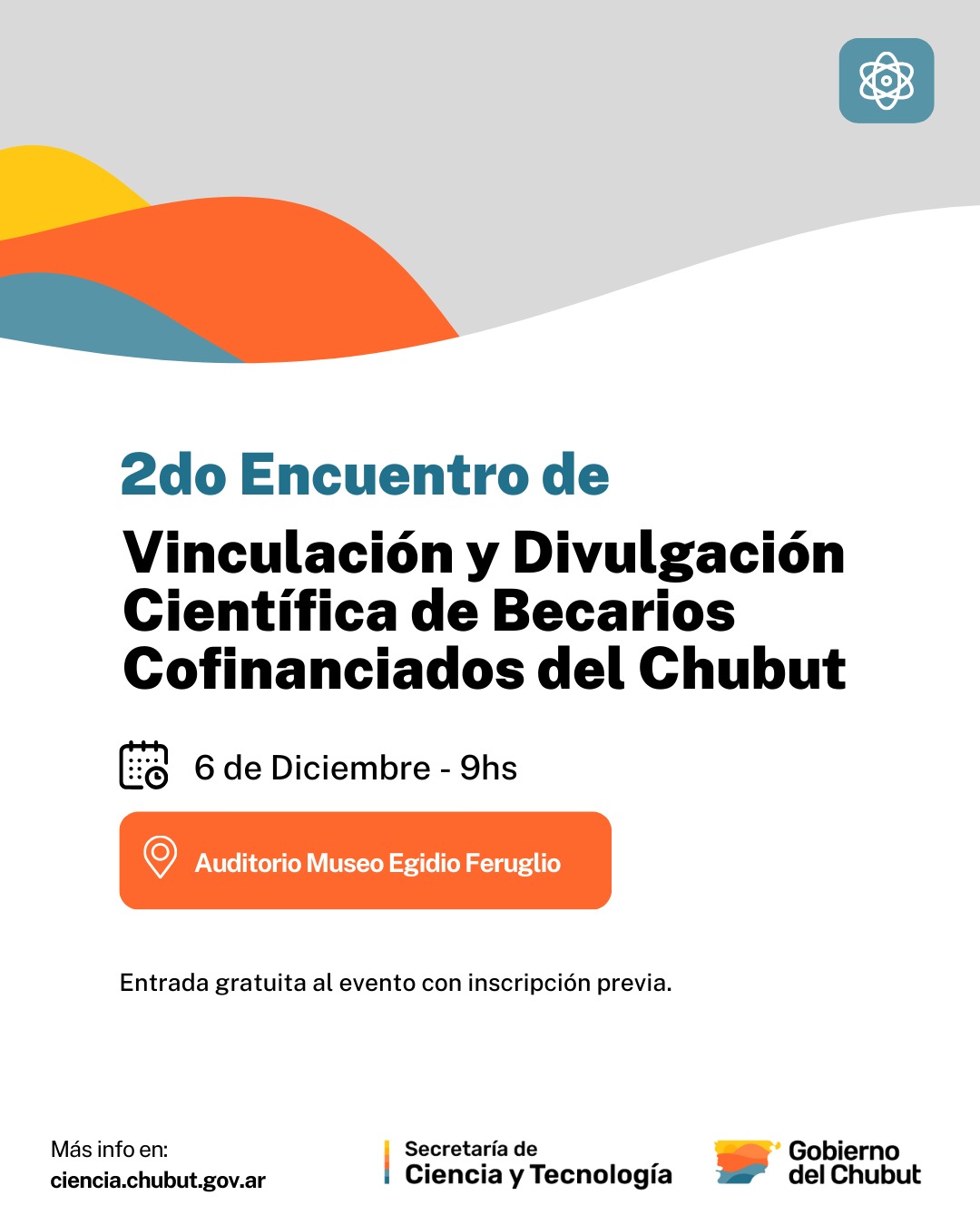 El Gobierno del Chubut que conduce Ignacio “Nacho” Torres, a través de la Secretaría de Ciencia y Tecnología, invita a participar del II Encuentro de Vinculación y Divulgación Científica, que se realizará este viernes 6 de diciembre de 9 a 18 horas en el auditorio del Museo Paleontológico Egidio Feruglio (MEF), en Trelew.