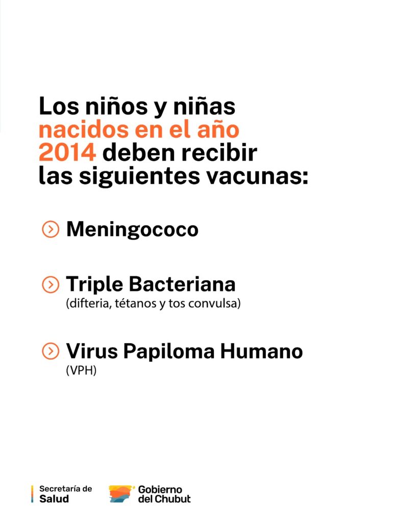 Por su parte, los nacidos en 2014 deben recibir la vacuna Triple Bacteriana Acelular, que previene la Difteria, el Tétanos y la Tos Convulsa; la vacuna contra el Virus del Papiloma Humano (VPH), que previene el cáncer de cuello uterino en las niñas y otros cánceres relacionados al VPH tanto en mujeres como en hombres, y cuyo esquema se modificó y pasó a ser de una sola dosis; y, finalmente, una dosis de la vacuna contra el Meningococo.