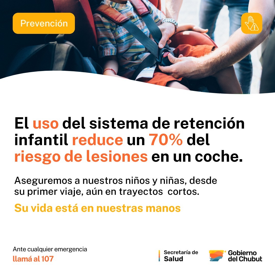 En el marco del aumento del tráfico en las distintas rutas provinciales y nacionales durante la temporada estival; el Gobierno del Chubut, a través de la Secretaría de Salud, recordó a la comunidad medidas para prevenir lesiones en menores por causa de siniestros viales, al destacar la obligatoriedad del uso del Sistema de Retención Infantil (SRI).
