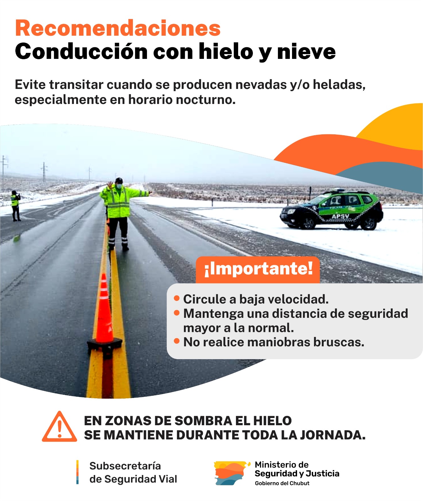 El Gobierno Provincial, que conduce Ignacio “Nacho” Torres, a través de la Subsecretaría de Seguridad Vial dependiente del Ministerio de Seguridad y Justicia, formuló una serie de recomendaciones de conducción ante la presencia de hielo o nieve en la calzada.