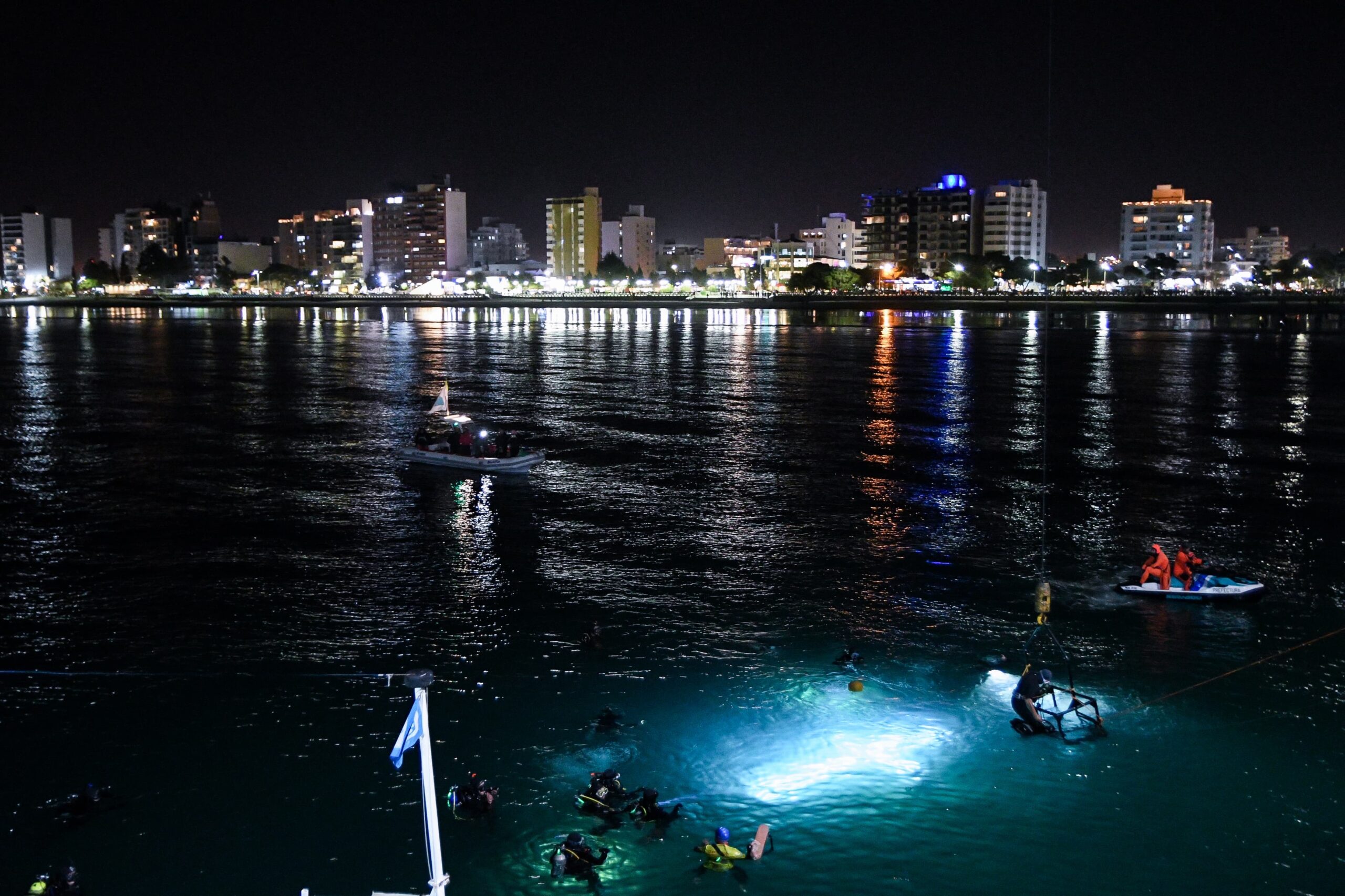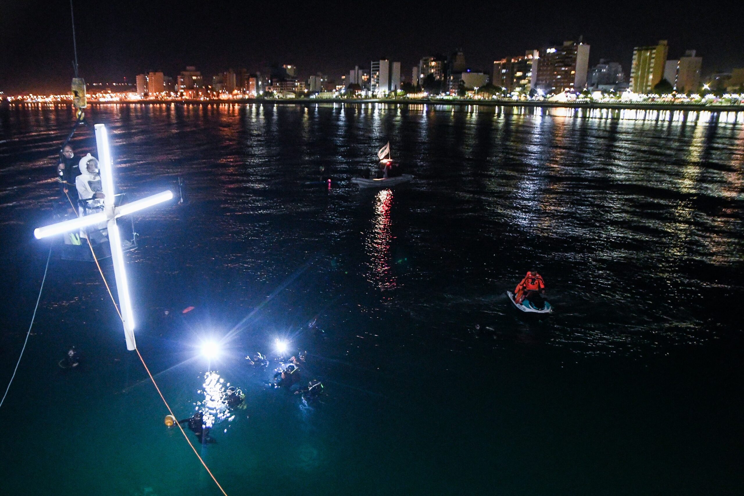 Asimismo, quienes estuvieron, nuevamente, a cargo de la logística de la etapa submarina fueron “Pinino” Orri y “El Bebo” Vera. Además, se contó con la colaboración del Club Náutico Atlántico Sud y Máximo Urtasun en el acondicionamiento de la cruz iluminada de agua.