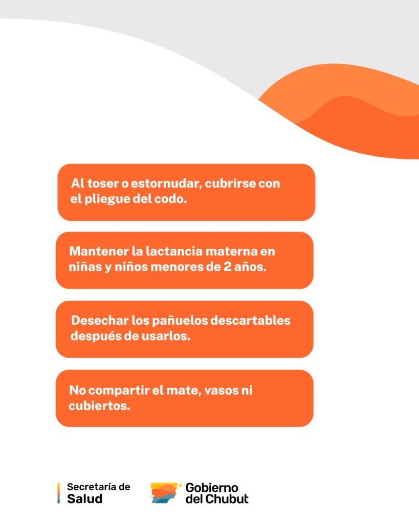 Desde la Secretaría de Salud se informó sobre ciertas medidas a cumplir, simples y efectivas, para la prevención de las enfermedades respiratorias, entre ellas: lavarse las manos con frecuencia con agua y jabón; ventilar los ambientes de manera regular; al toser o estornudar, cubrirse con el pliegue del codo; mantener la lactancia materna en niñas y niños menores de 2 años; desechar los pañuelos descartables después de usarlos; y no compartir el mate, vasos ni cubiertos.