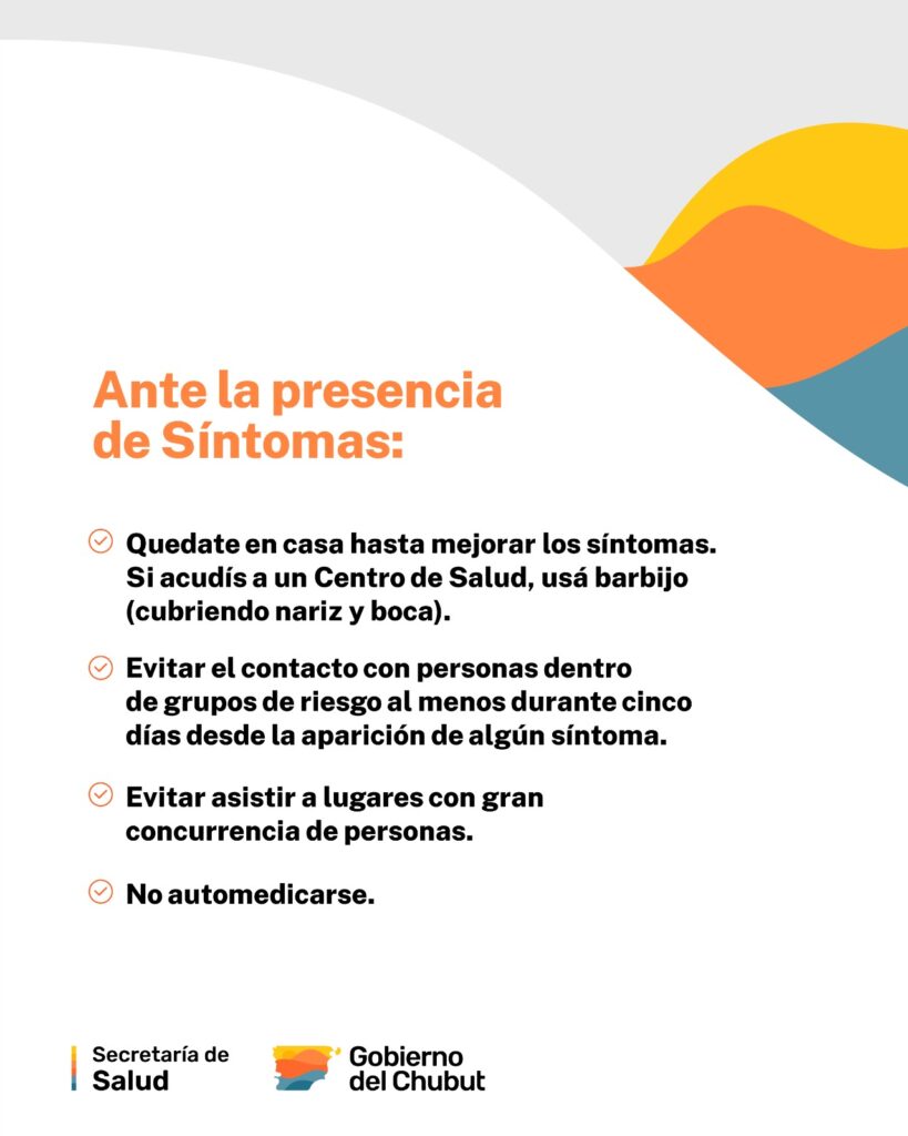 Asimismo, se debe evitar el contacto con personas dentro de los grupos de riesgo (menores de 2 años, personas gestantes, mayores de 65 años e inmunocomprometidos) al menos durante cinco días desde la aparición de algún síntoma de infección respiratoria, como así también evitar asistir a lugares con gran concurrencia de personas (eventos, transporte público, lugares de trabajo), y no automedicarse.